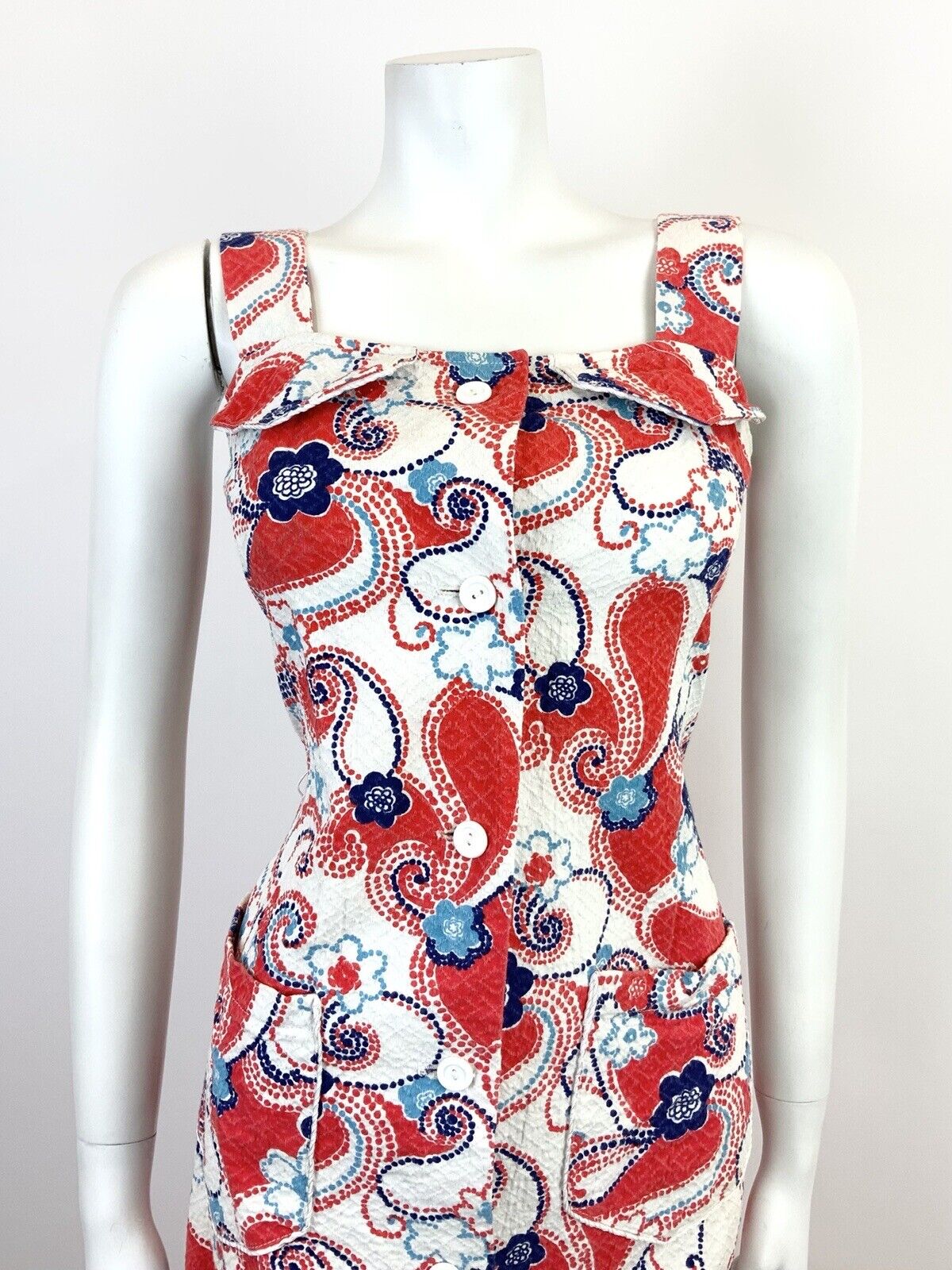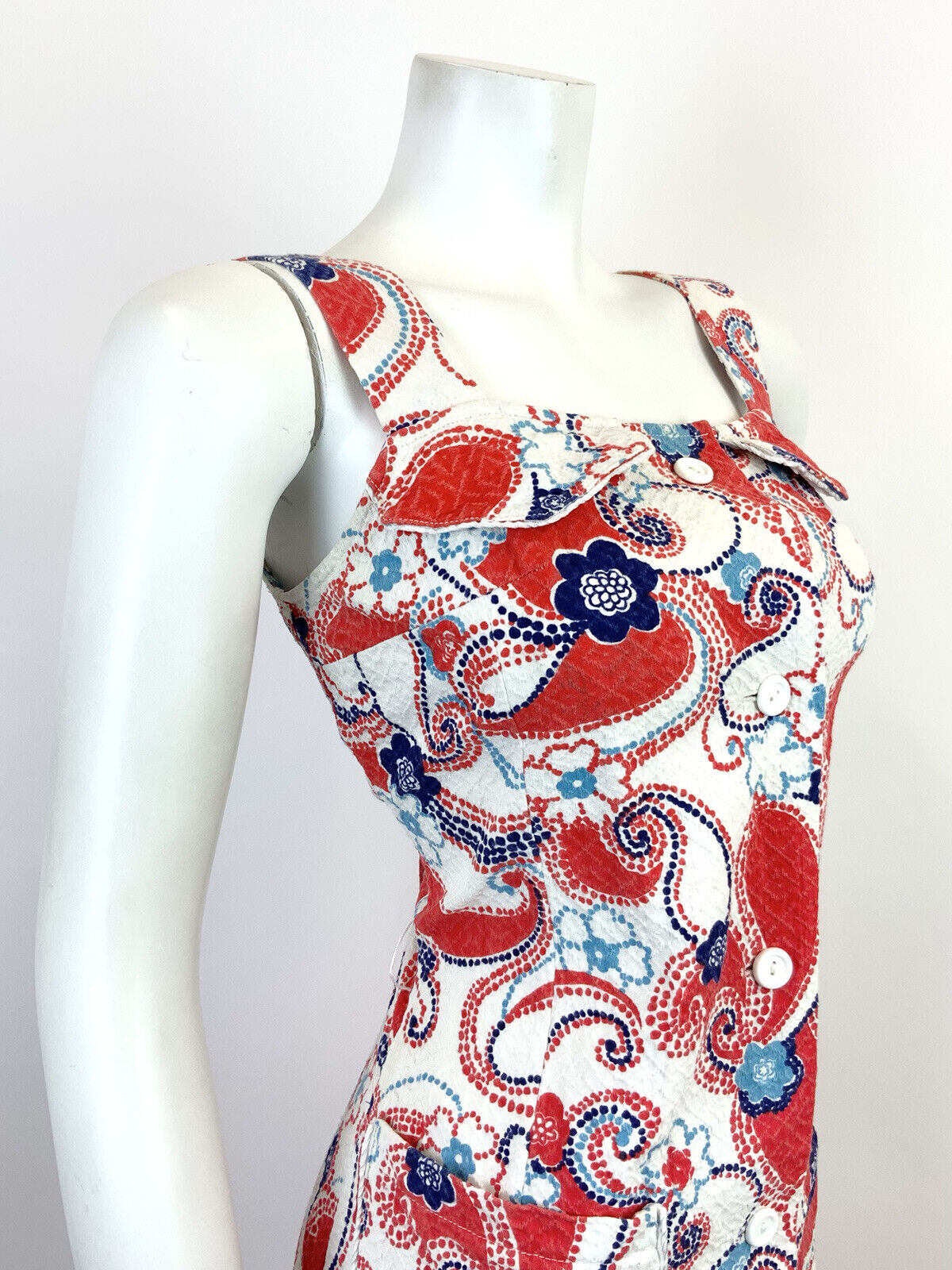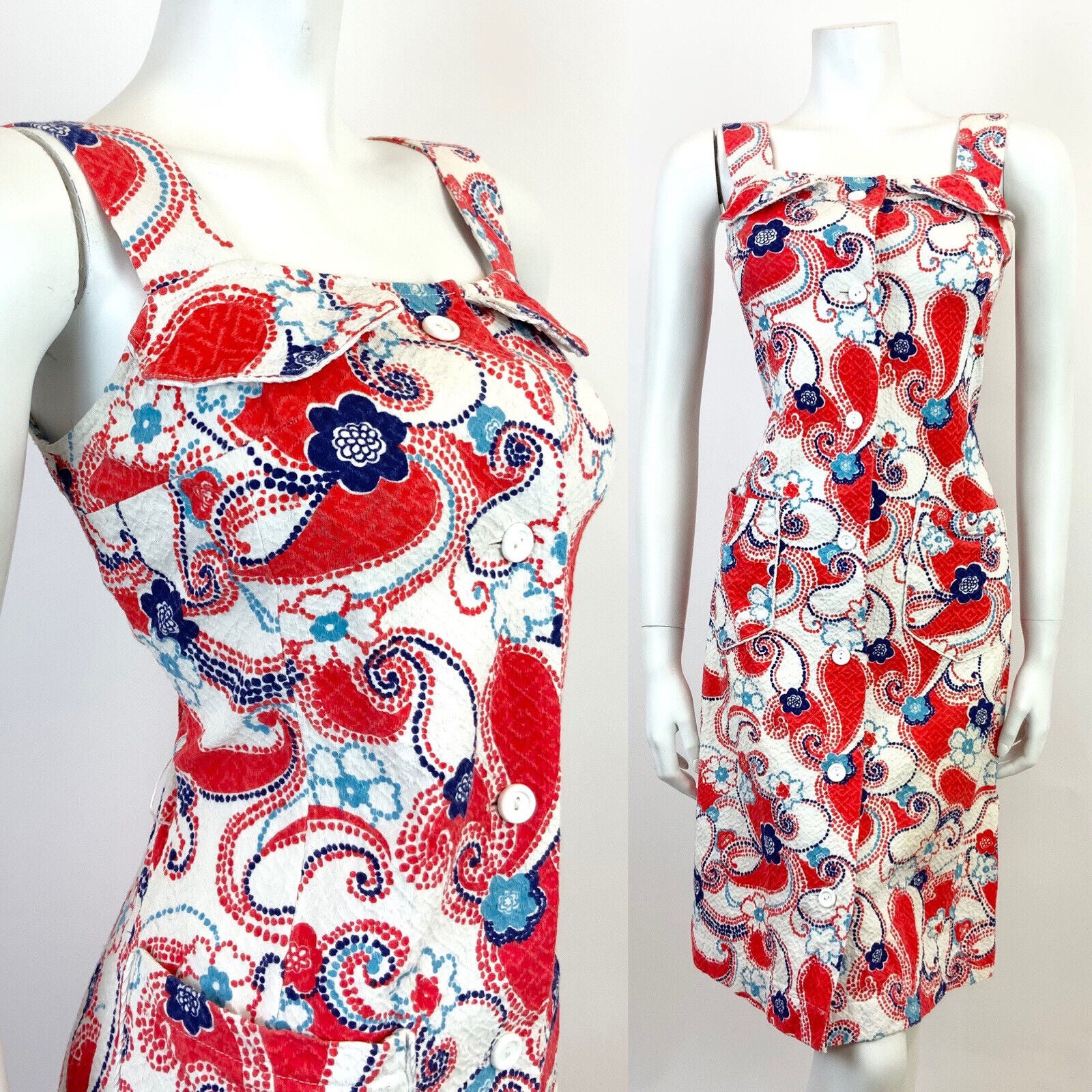 VTG 60s 70s WHITE RED BLUE FLORAL DOTTY PAISLEY PSYCHEDELIC MOD SUNDRESS 8 10