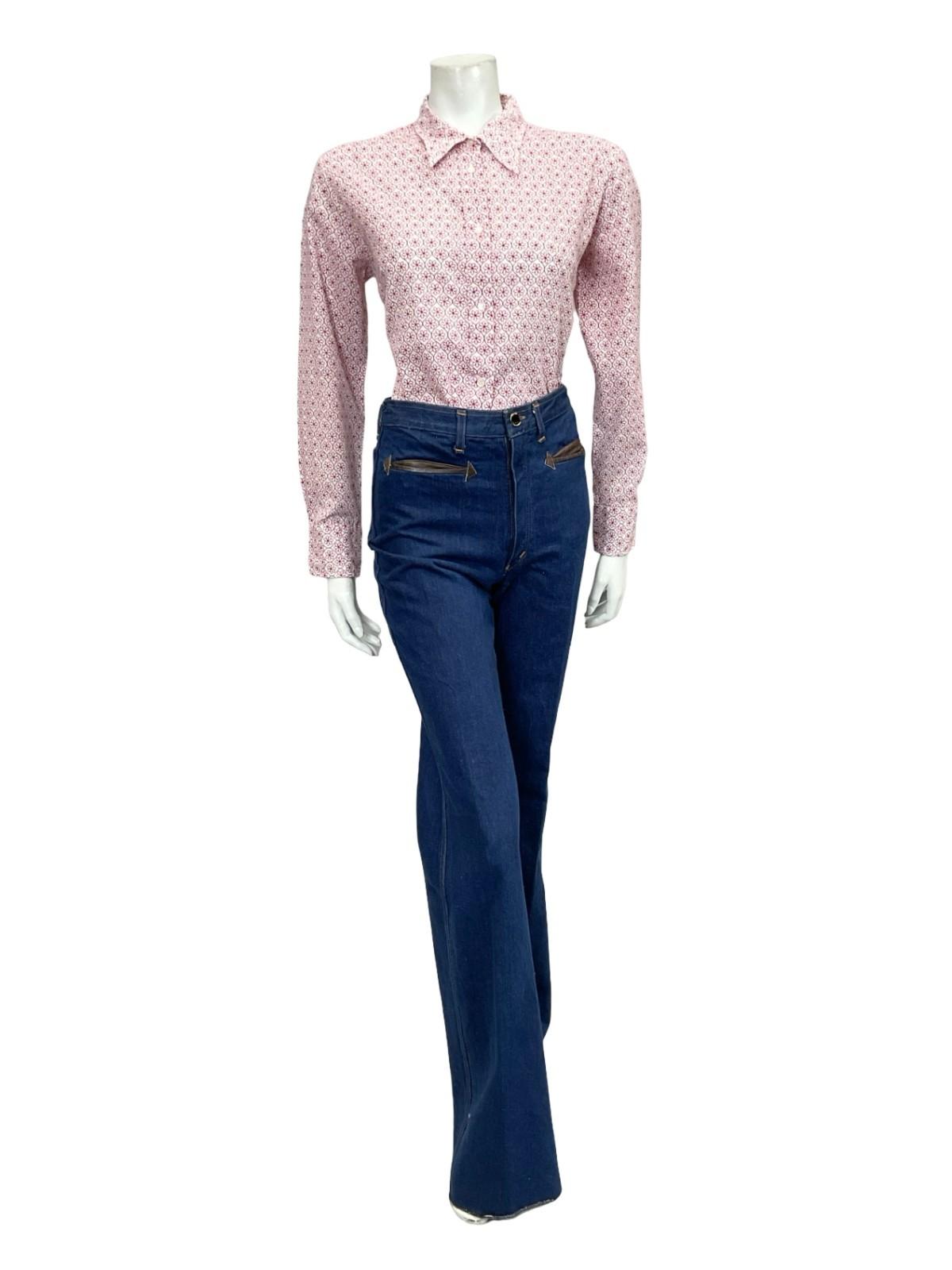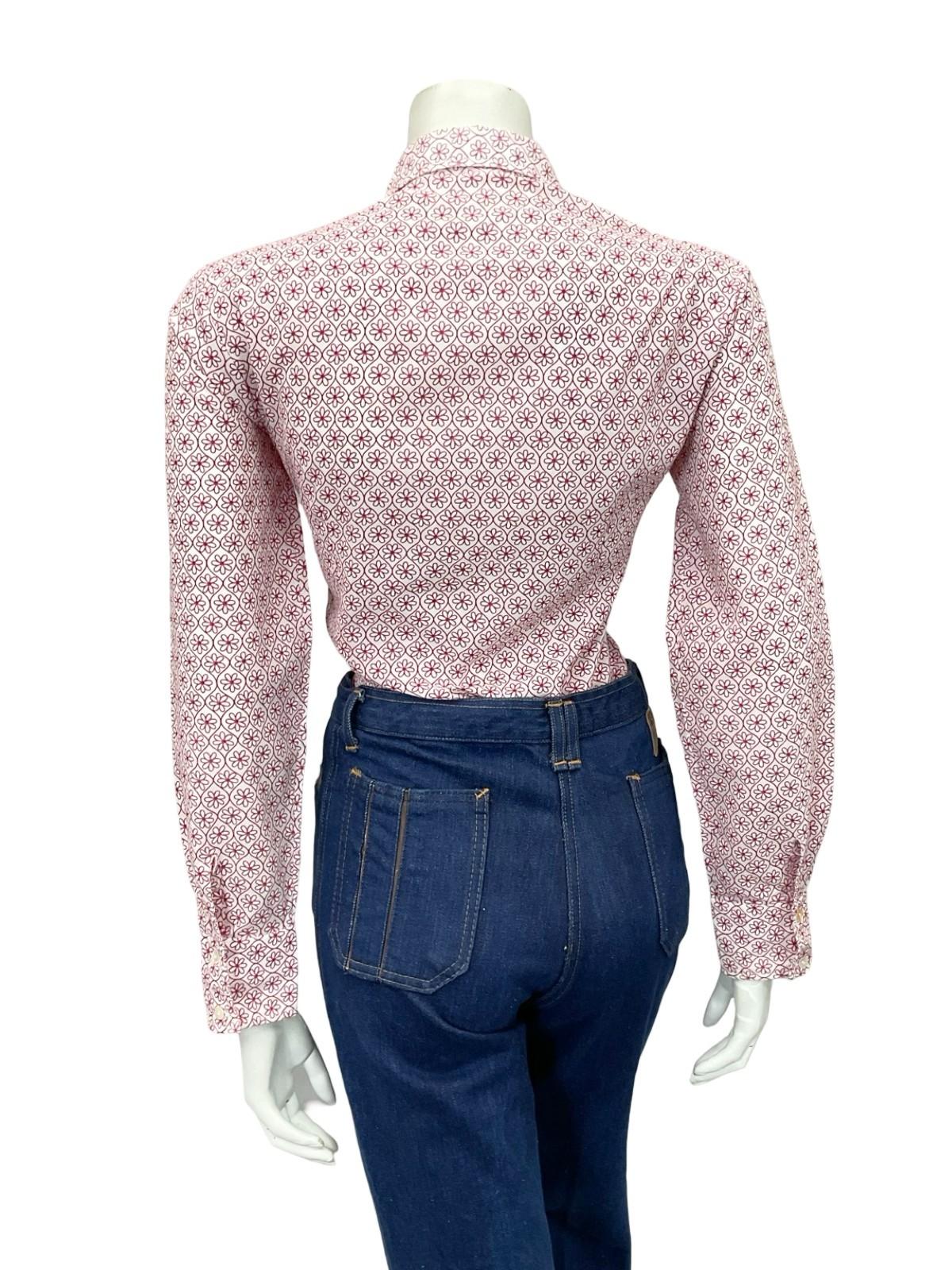 This is a lovely 60s 70s long sleeve shirt with a dagger collar and geometric floral wavy tile print. This shirt feels to be made from a red and white polycotton blend, similar to the feel of most shirts. There are 6 white pearlescent buttons down the front, with two buttons on either cuff.