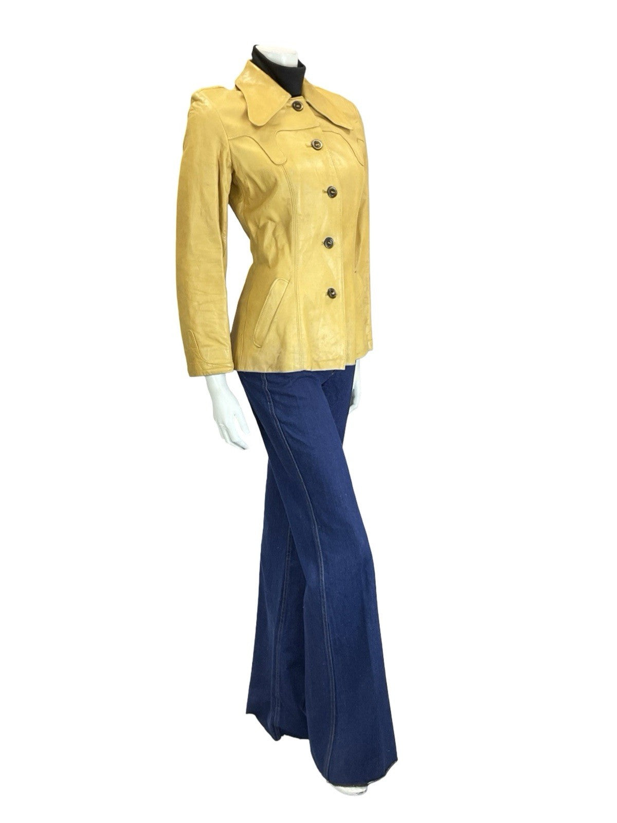 VTG 60S 70S YELLOW LIGHT TAN LEATHER WESTERN BOHO YOKE DOG EAR JACKET 8 10 S