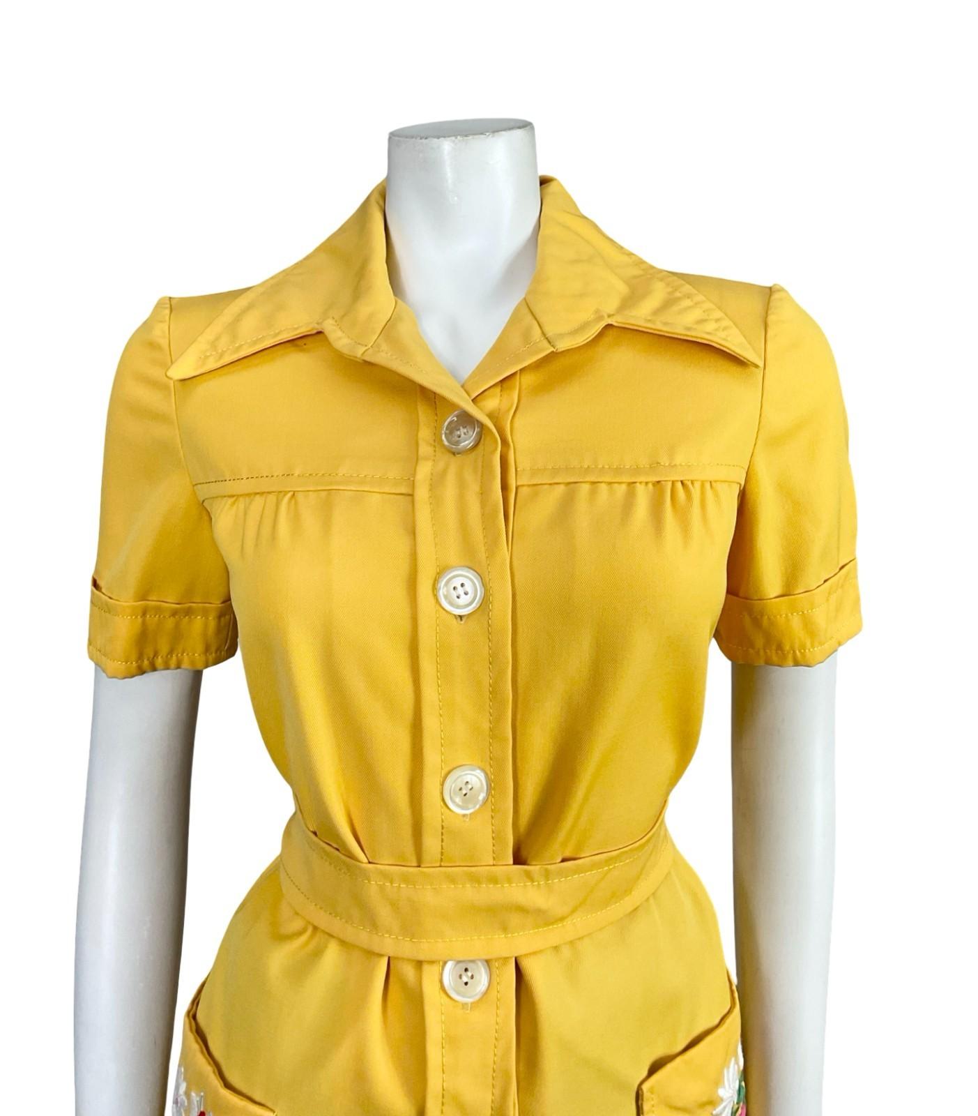 VTG 60S 70S YELLOW PINK WHITE GREEN FLORAL EMBROIDERED TIE WAIST DAGGER SHIRT 8