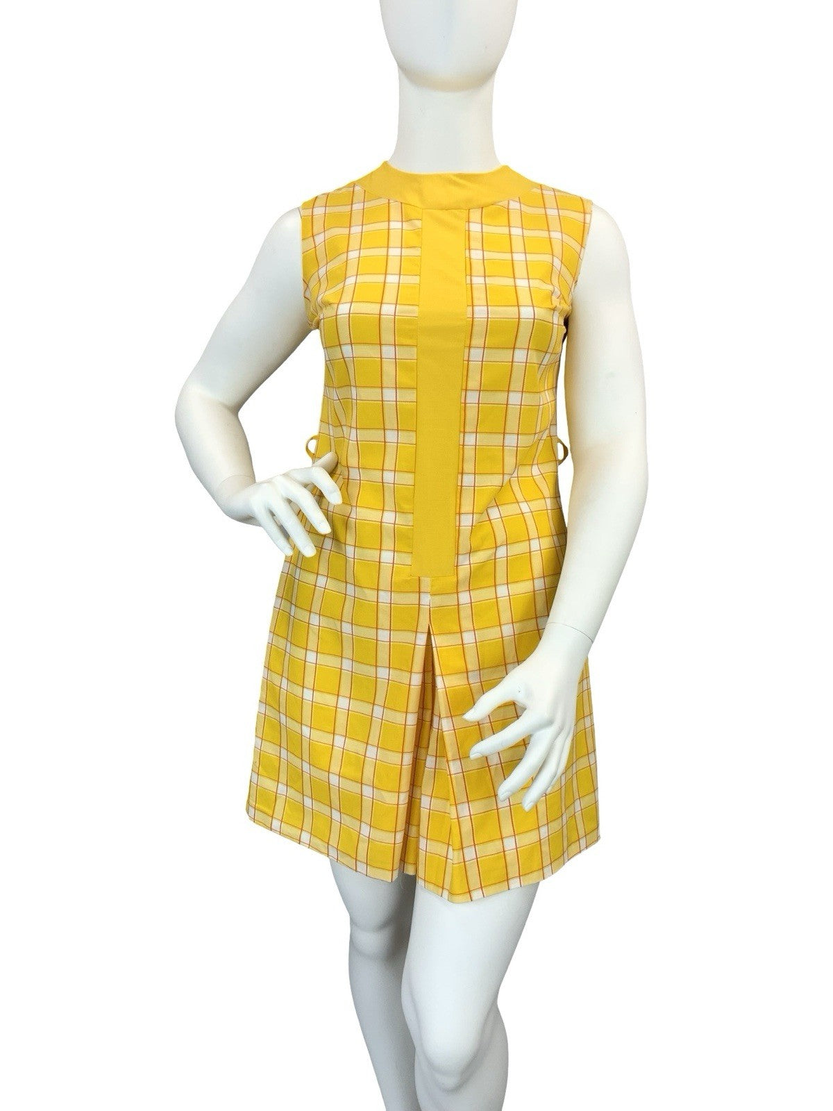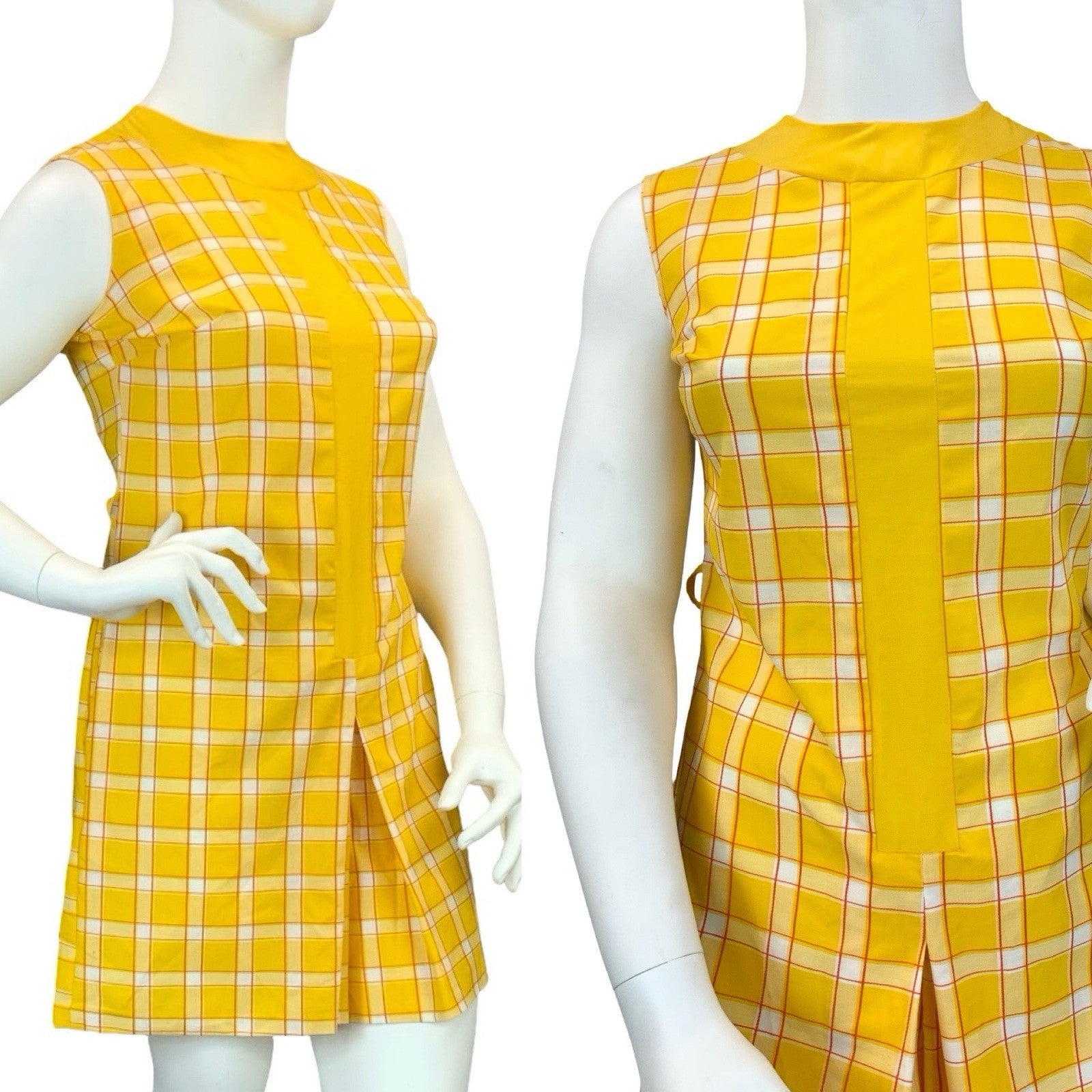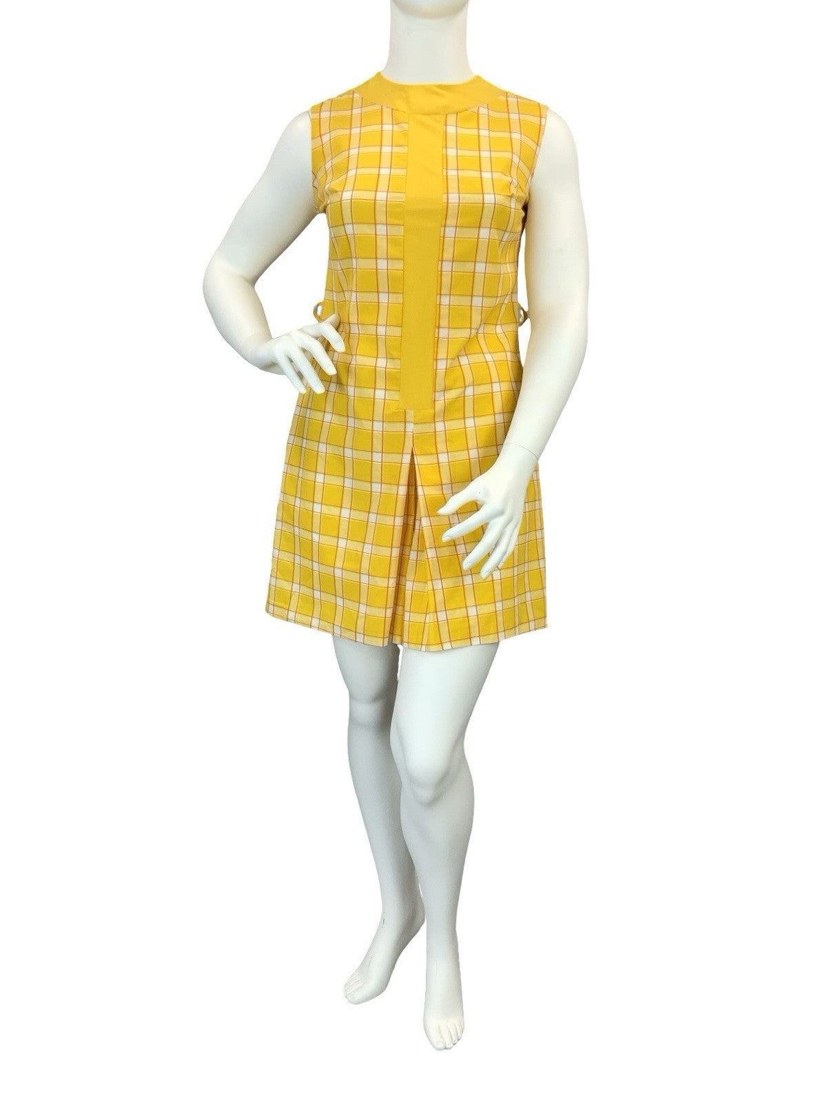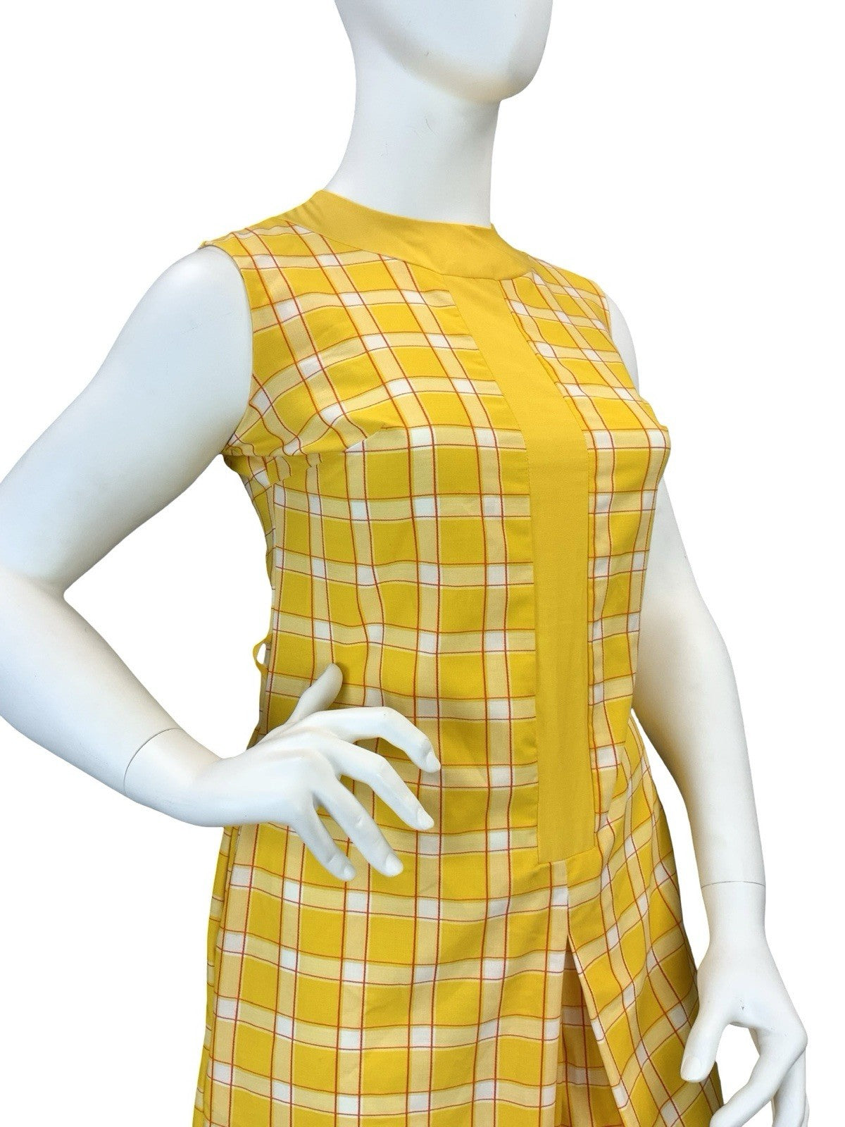 VTG 60S 70S YELLOW RED WHITE PLAID RETRO MOD PLEAT PLAYSUIT JUMPSUIT 16 14