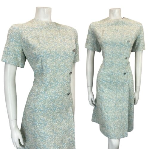 VTG 60S BLUE WHITE GOLD SWIRLY SPARKLY MOD DIAMANTE PARTY SHIFT DRESS 14 16
