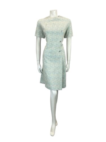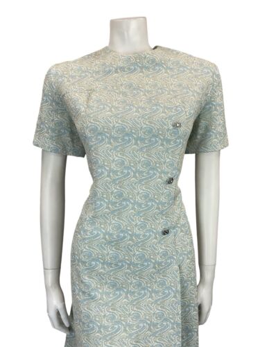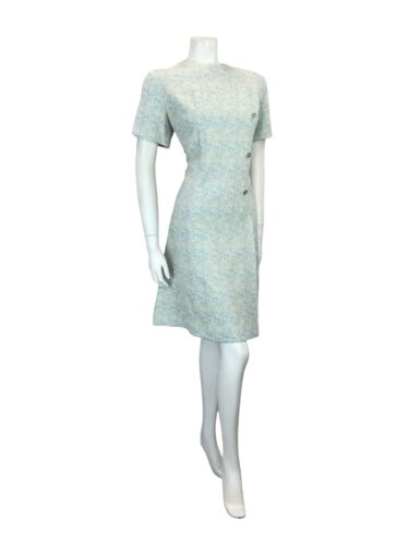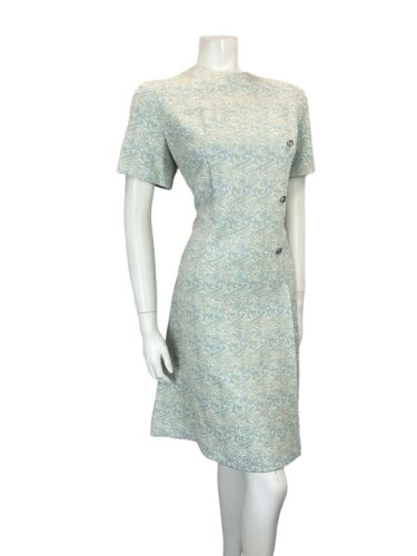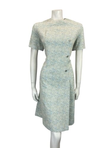 This is a gorgeous light blue, white and gold sparkling party dress made from a swirling patterned polyester fabric. This short sleeve dress has a shift cut to it, and a rounded neckline. This dress is decorated to the side with 3 diamante illusion buttons, showcasing one decorative pleat, and it has a zipper at the back to fasten you in. There is no inner lining to this dress. It is a perfect choice for any vintage lover looking for classic 60s shapes in their party wear, and we think it would look great paired with some 60s style white shoes. This material has no stretch, so please compare your measurements to those below. This dress would best fit: UK14-16 please check your measurements against the ones provided below, Bust: 40" Waist: 37" Hips: 44" Length: 37.5" PLEASE NOTE: This garment has been measured flat and doubled for bust (armpit to armpit), waist and hip measurements, we measure the length down the back of the dress, measurements may differ slightly due to dress styles and fabrics. We ignore any existing size labels as vintage brands differed so much. Items shown on our mannequin may be clipped to fit. This garment is true vintage so please be aware there may be some signs of wear as expected from a garment of this age. We do not list stains to area likes linings that are hidden or things that can bearly be seen without close inspection. These can include pin holes, small marks, light piling. We hand pick our items to make sure they are in great condition and fully wearable and we reject anything of poor condition. The majority of our items are 40-70 years old. If you think we've missed something significant please get in touch, we are only human and we lose transaction fees on returns so we don't skip things on purpose. CHECK OUT OUR OTHER ITEMS, WE LIST EVERY WEEK! |