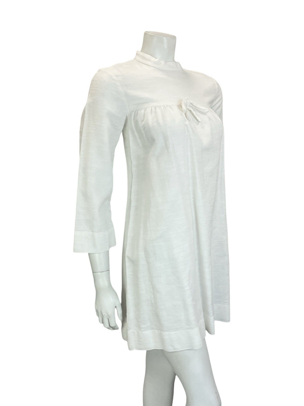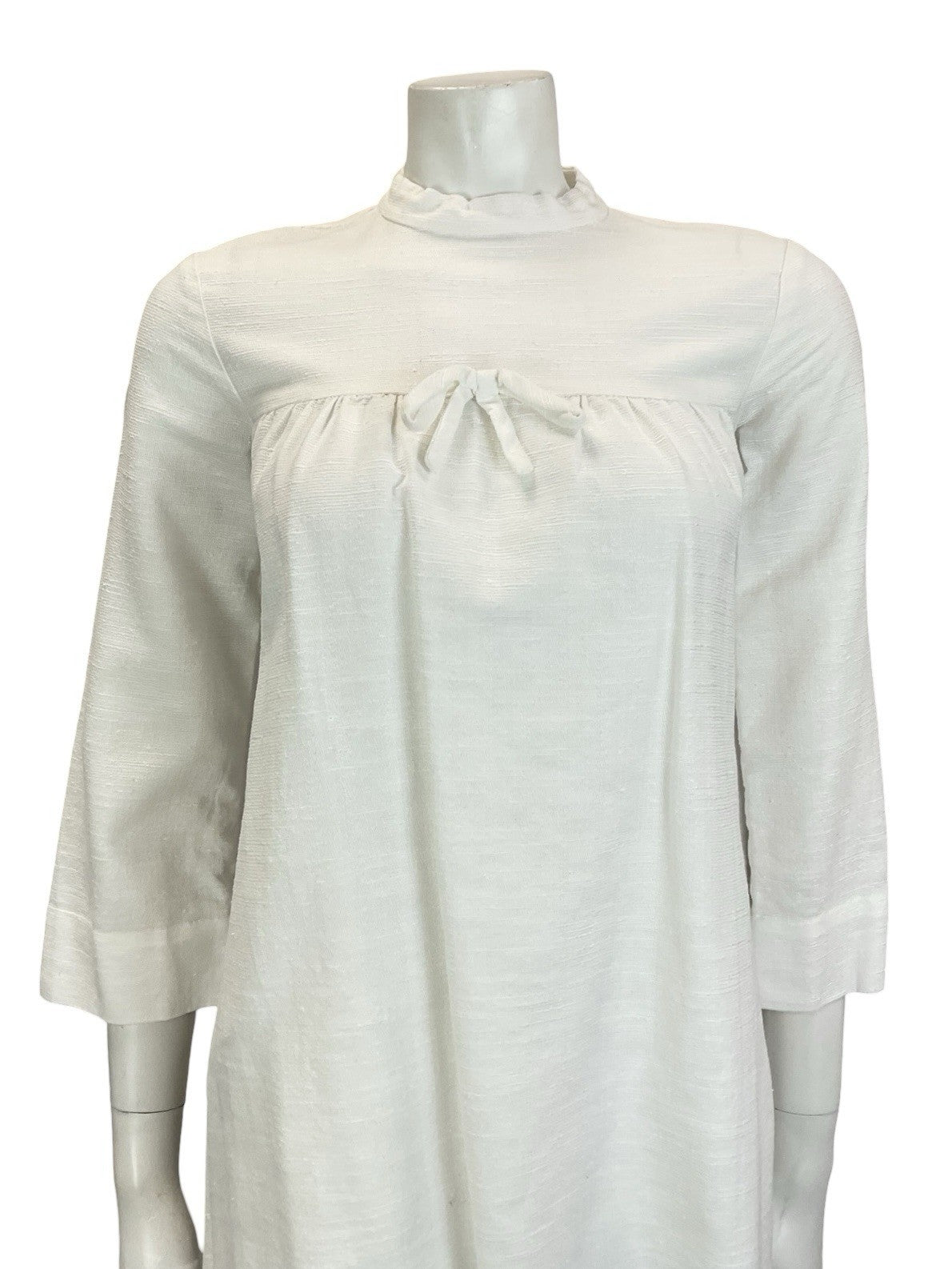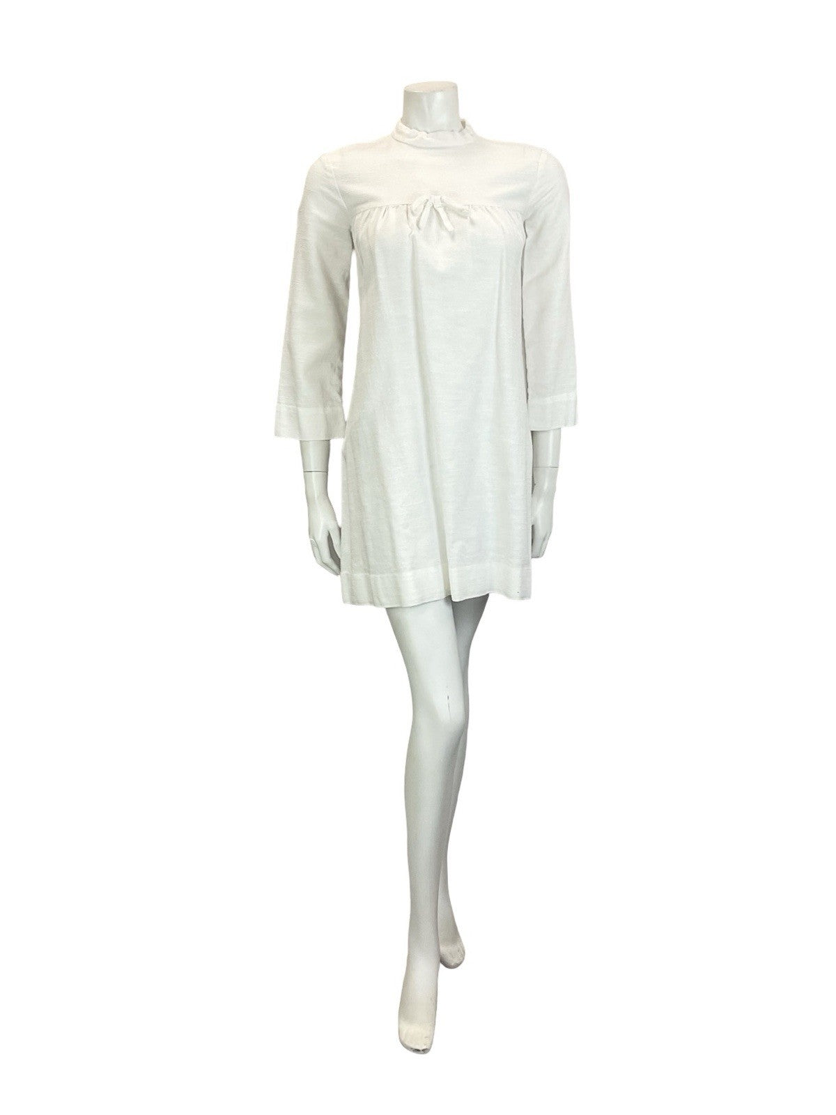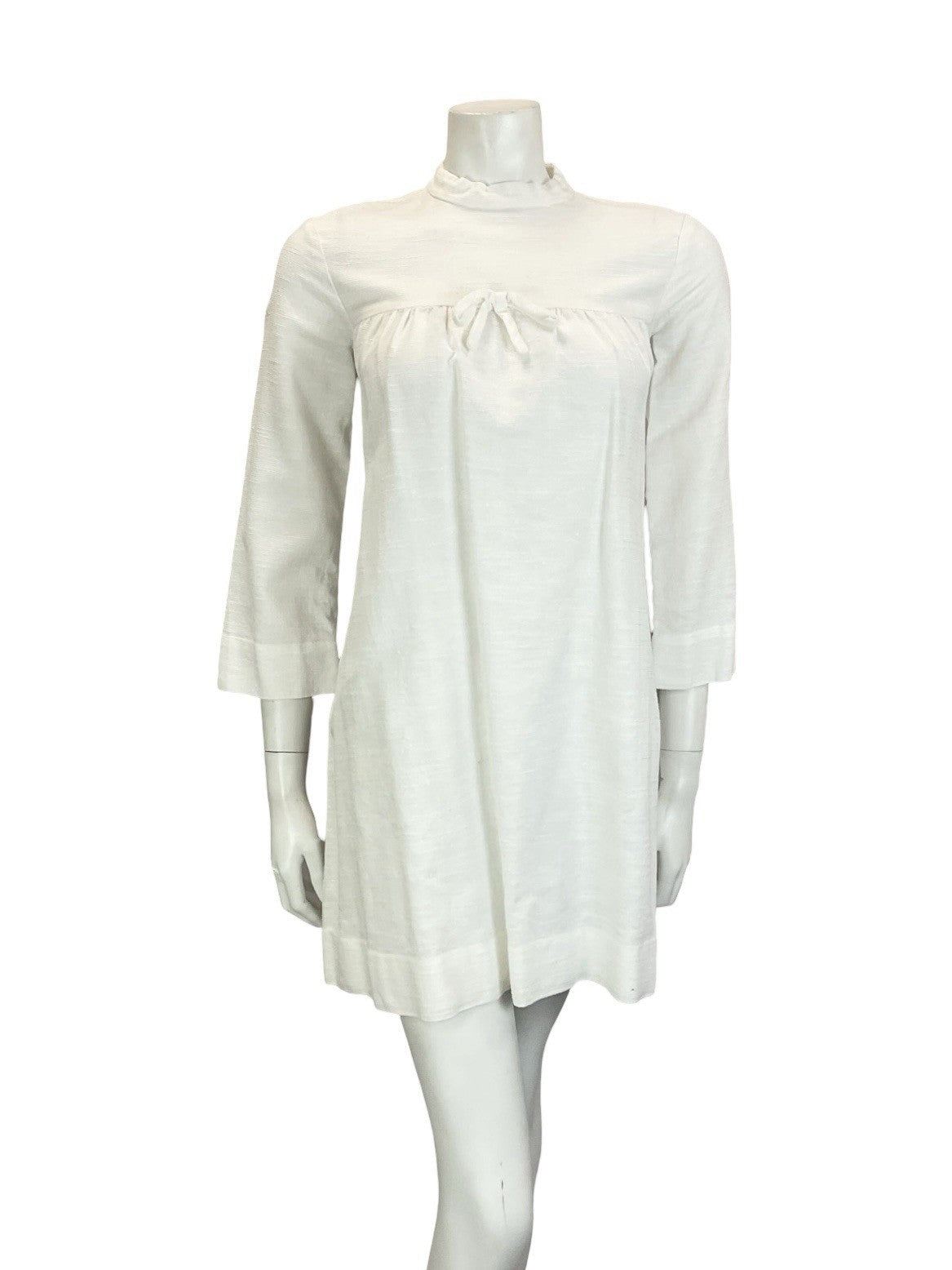 VTG 60S MOD GOGO WHITE BRIDAL COTTON 3/4 SLEEVE BOW SMOCK TENT DRESS 8