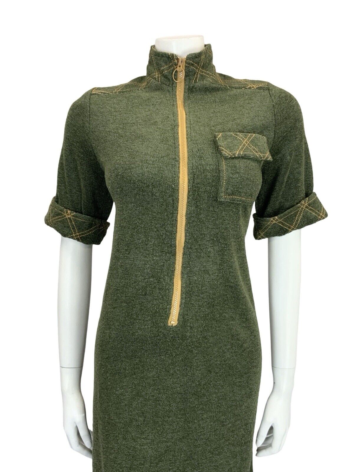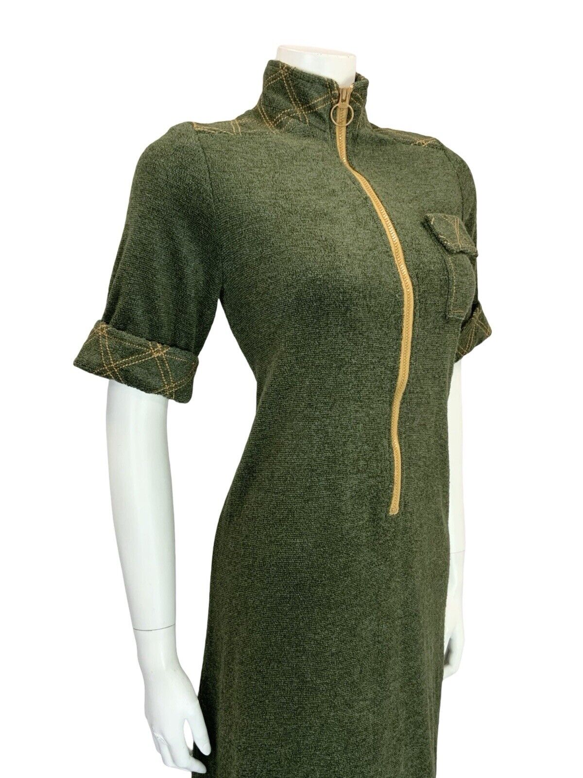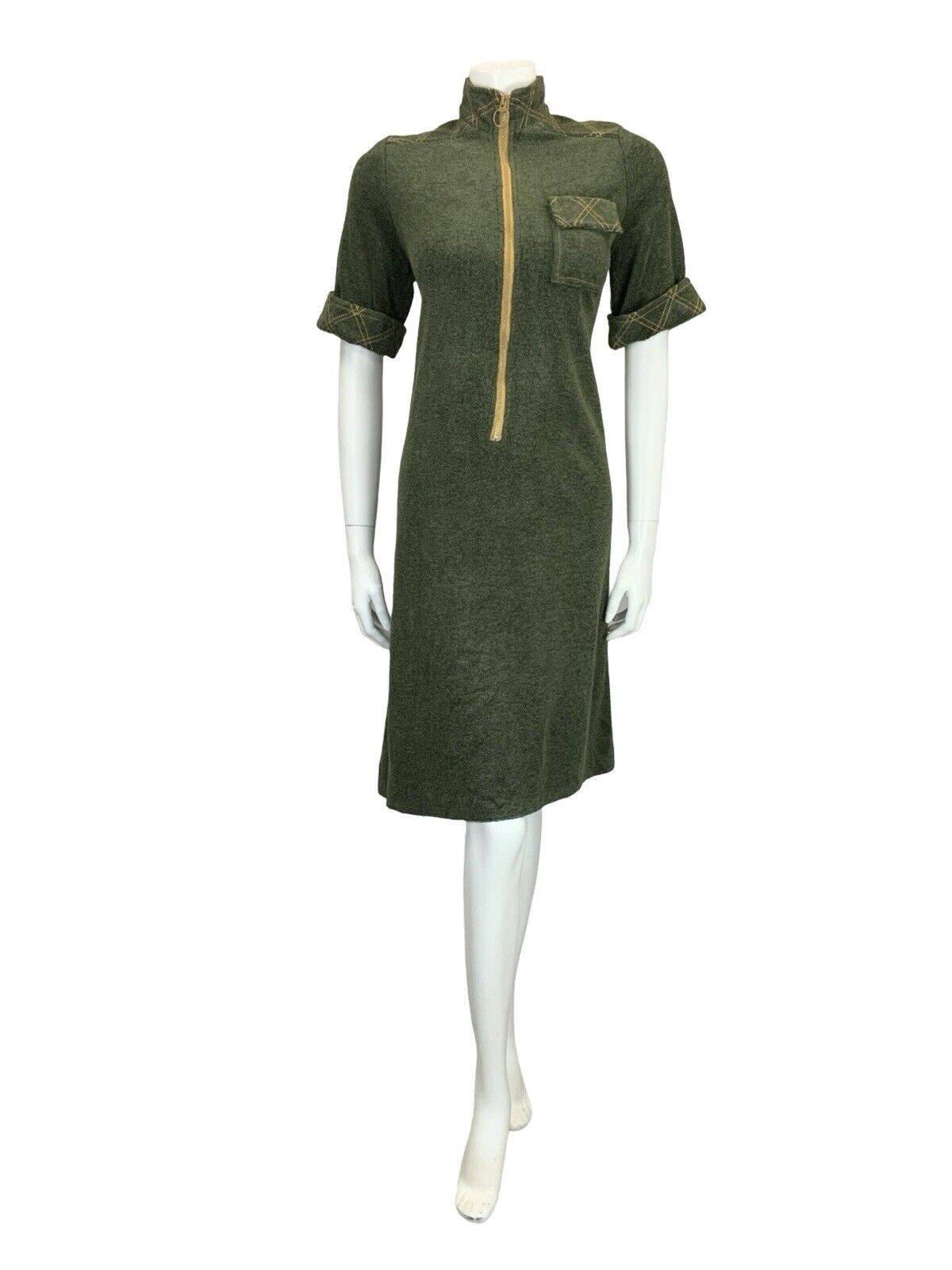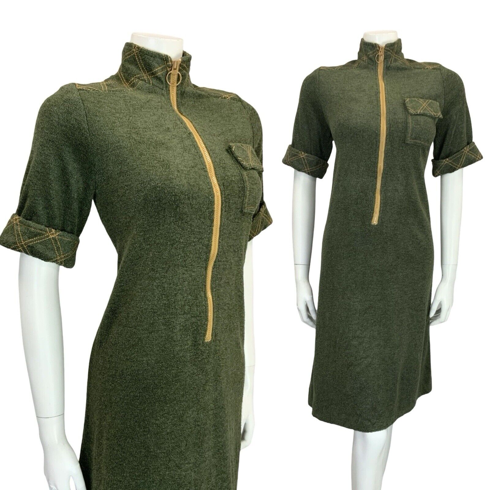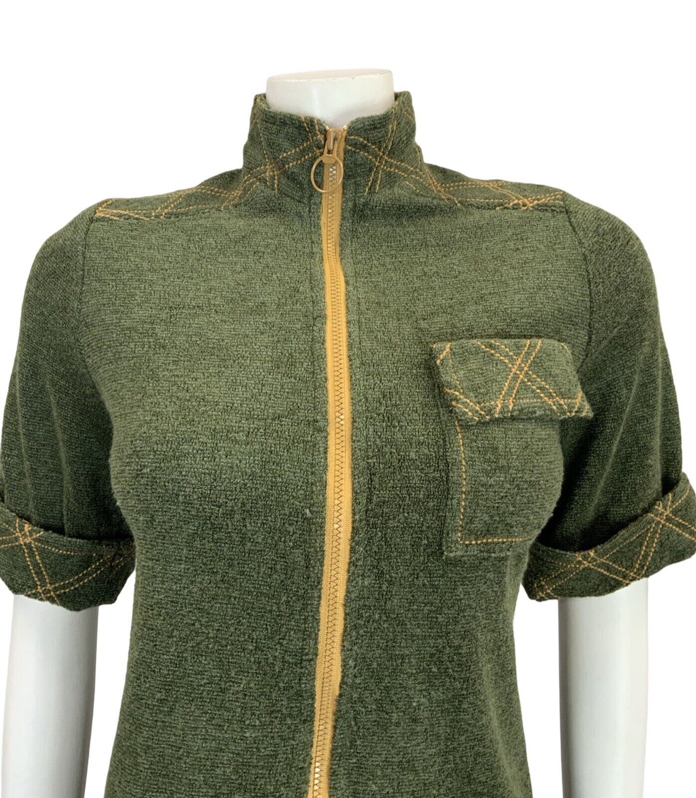 VTG 60S MOD SCOOTER GREEN MUSTARD YELLOW CONTRAST STITCH TOWEL SHIFT DRESS 10