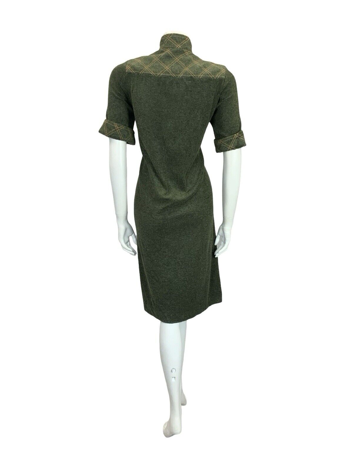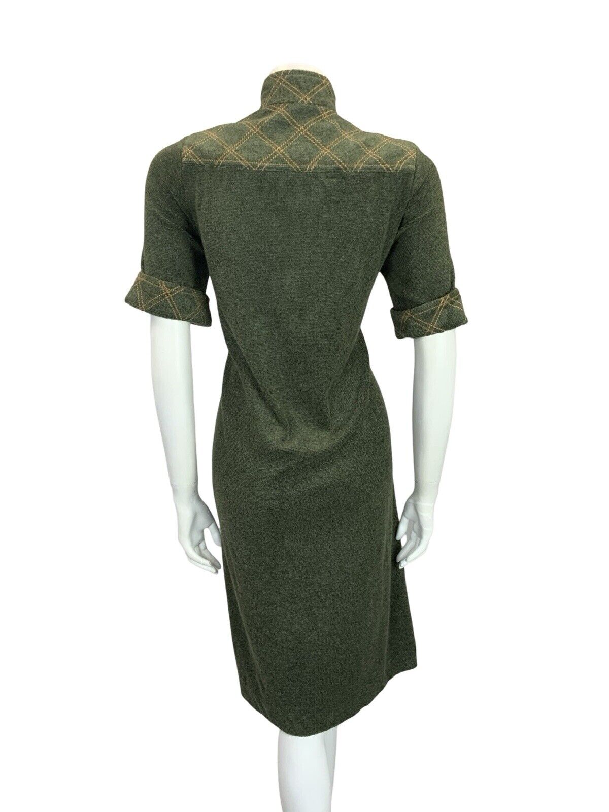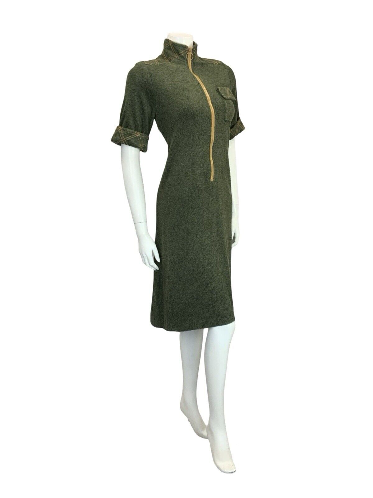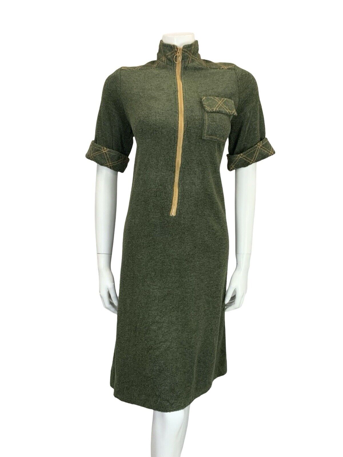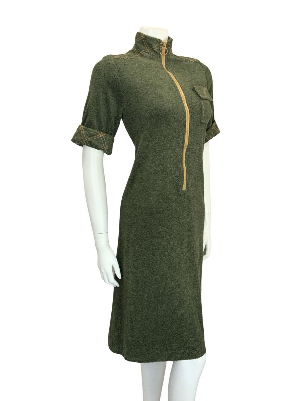 This is a lovely scooter mod style shift dress made from a cool toned dark green towelling. This dress has decorative mustard yellow contrast stitching in a grid shape on the funnel neck, shoulder panels and short sleeve cuffs, as well as the illusion pocket. This dress zips up the front with a matching mustard yellow zipper with an O ring. There is no inner lining to this dress. This is a comfortable and stylish option for anyone looking for. that mod style in muted, yet beautiful, tones. Why not have a look at our mod accessories and build your outfit? As this material has considerable amount of stretch, please take the time to compare your measurements to those given below, and to read our full description to avoid disappointment in sizing. This dress would best fit: UK10 (12 for a tighter look) please check your measurements against the ones provided below, Bust: 37" Waist: 35" Hips: 38" Length: 42" PLEASE NOTE: This garment has been measured flat and doubled for bust (armpit to armpit), waist and hip measurements, we measure the length down the back of the dress, measurements may differ slightly due to dress styles and fabrics. We ignore any existing size labels as vintage brands differed so much. Items shown on our mannequin may be clipped to fit. This garment is true vintage so please be aware there may be some signs of wear as expected from a garment of this age. We do not list stains to area likes linings that are hidden or things that can bearly be seen without close inspection. These can include pin holes, small marks, light piling. We hand pick our items to make sure they are in great condition and fully wearable and we reject anything of poor condition. The majority of our items are 40-70 years old. If you think we've missed something significant please get in touch, we are only human and we lose transaction fees on returns so we don't skip things on purpose. CHECK OUT OUR OTHER ITEMS, WE LIST EVERY WEEK! |