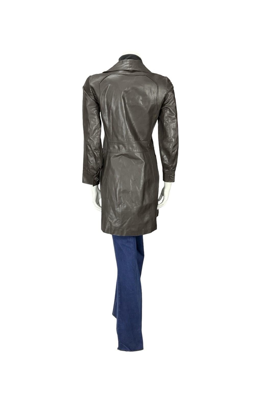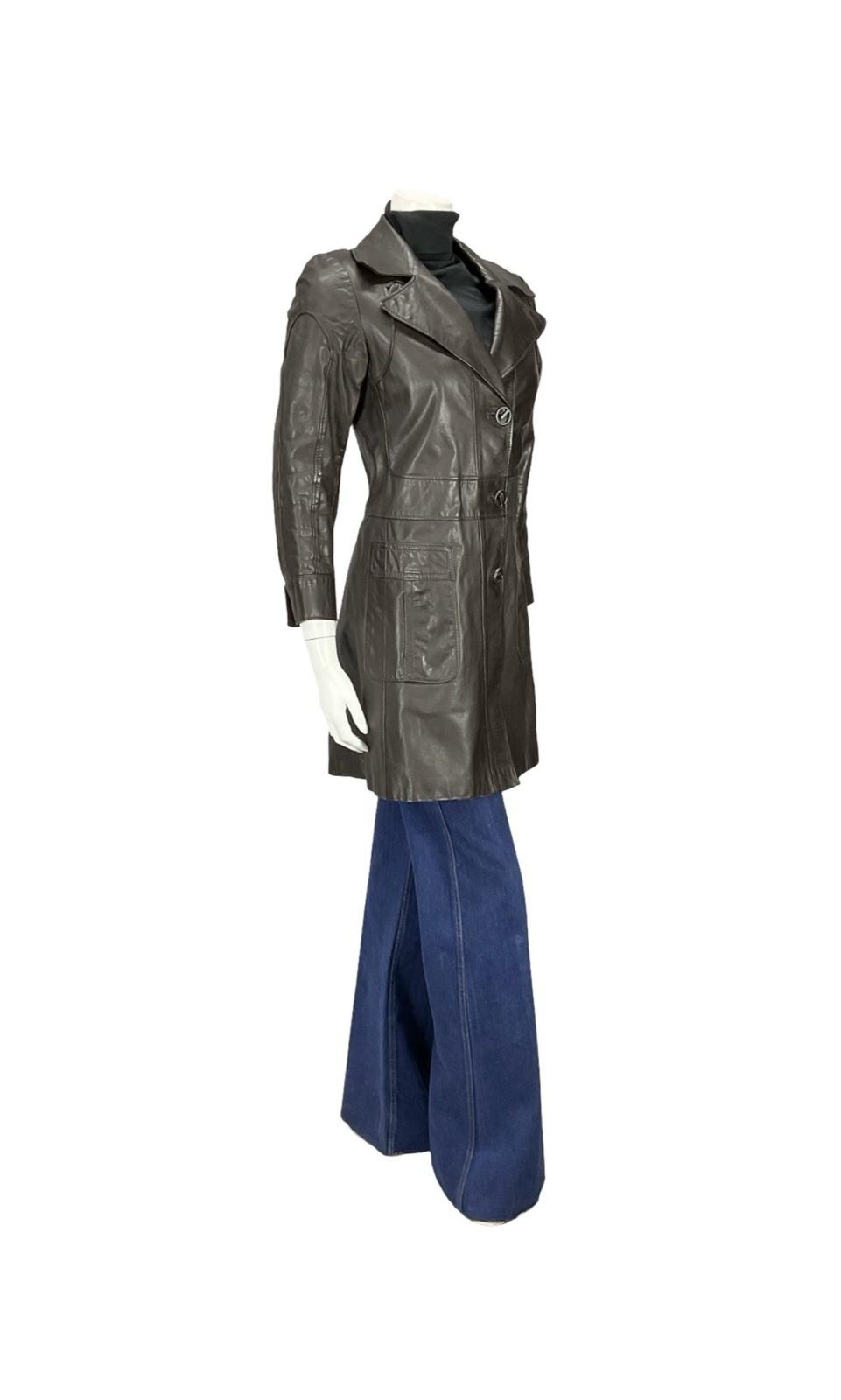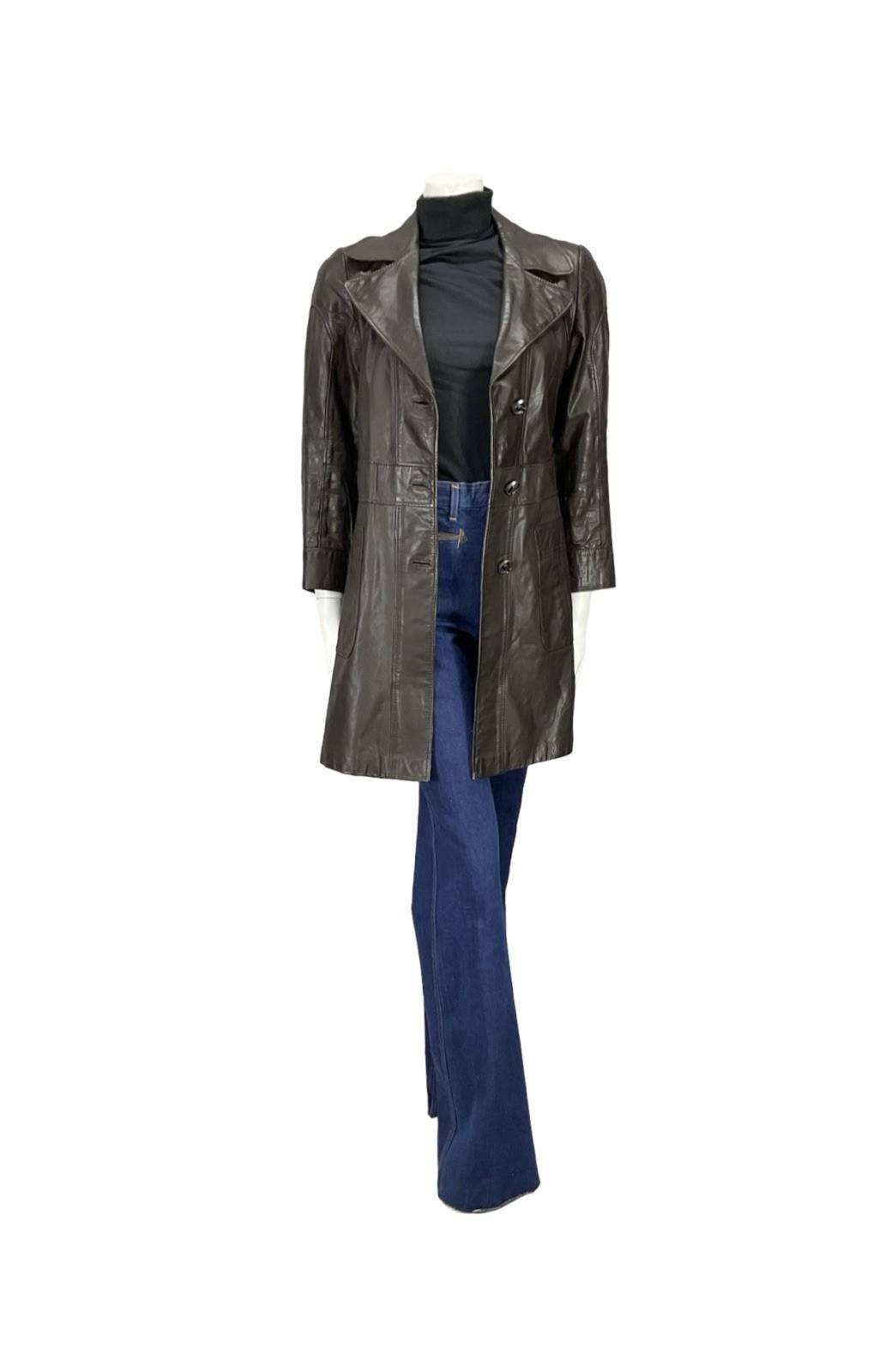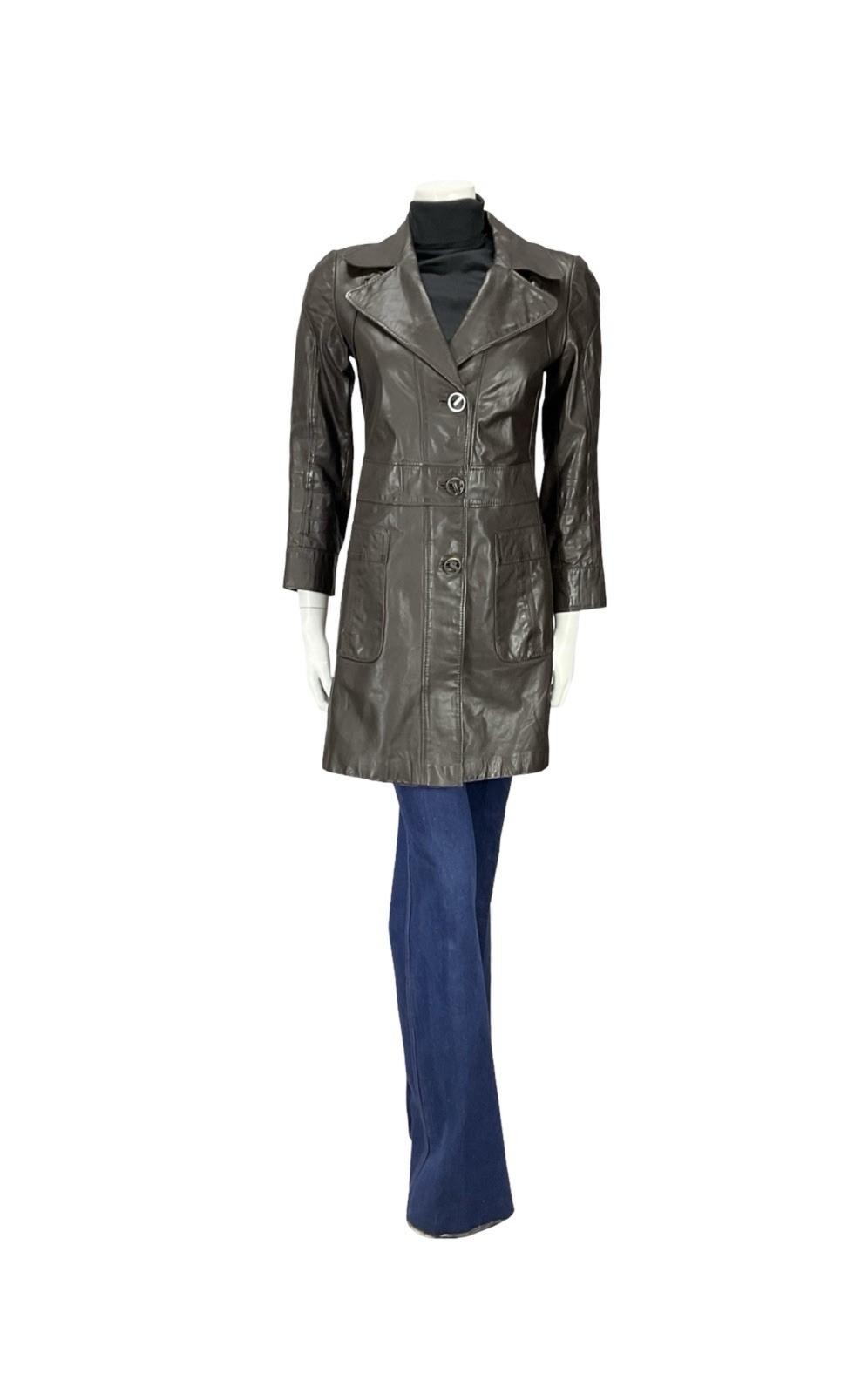 VTG 60S MOD SPACE AGE NOTCH LAPEL GEOMETRIC BROWN LEATHER TRENCH MAC JACKET 10