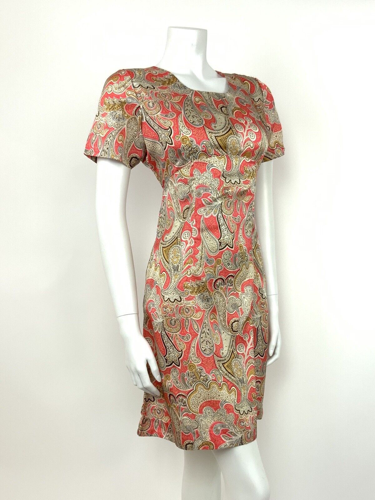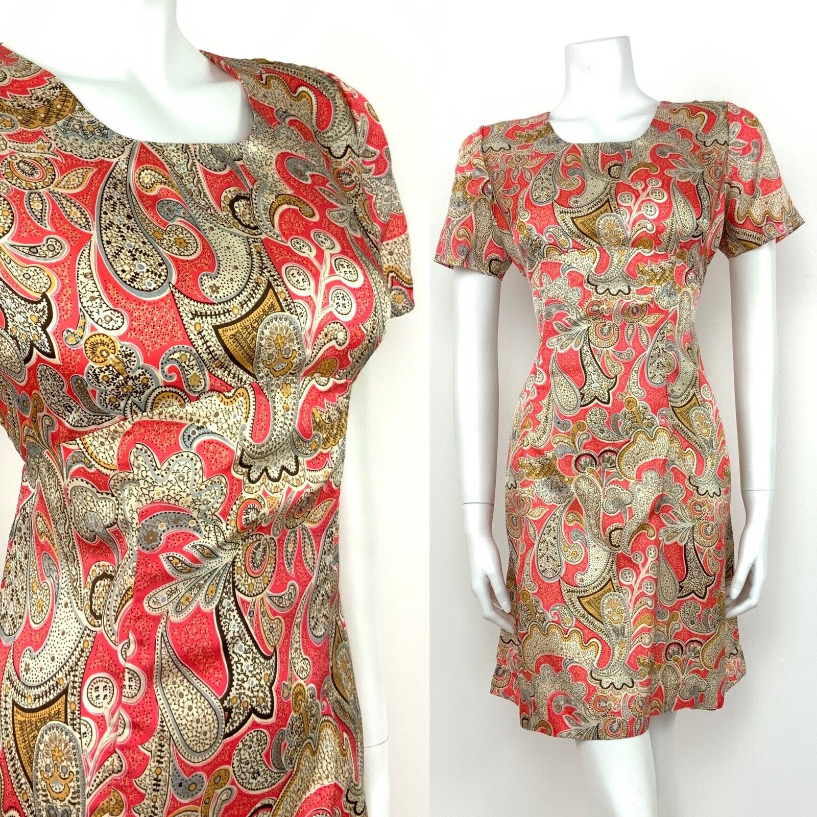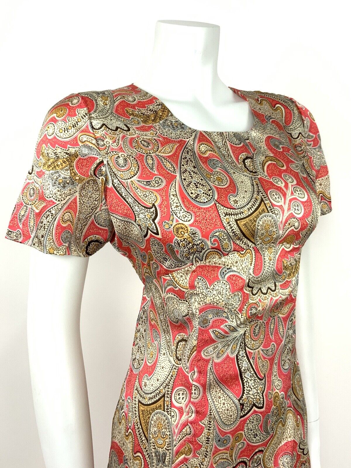 VTG 60s SUMMER DRESS PAISLEY FLORAL PINK SILVER CREAM GREY BROWN GOLD 12