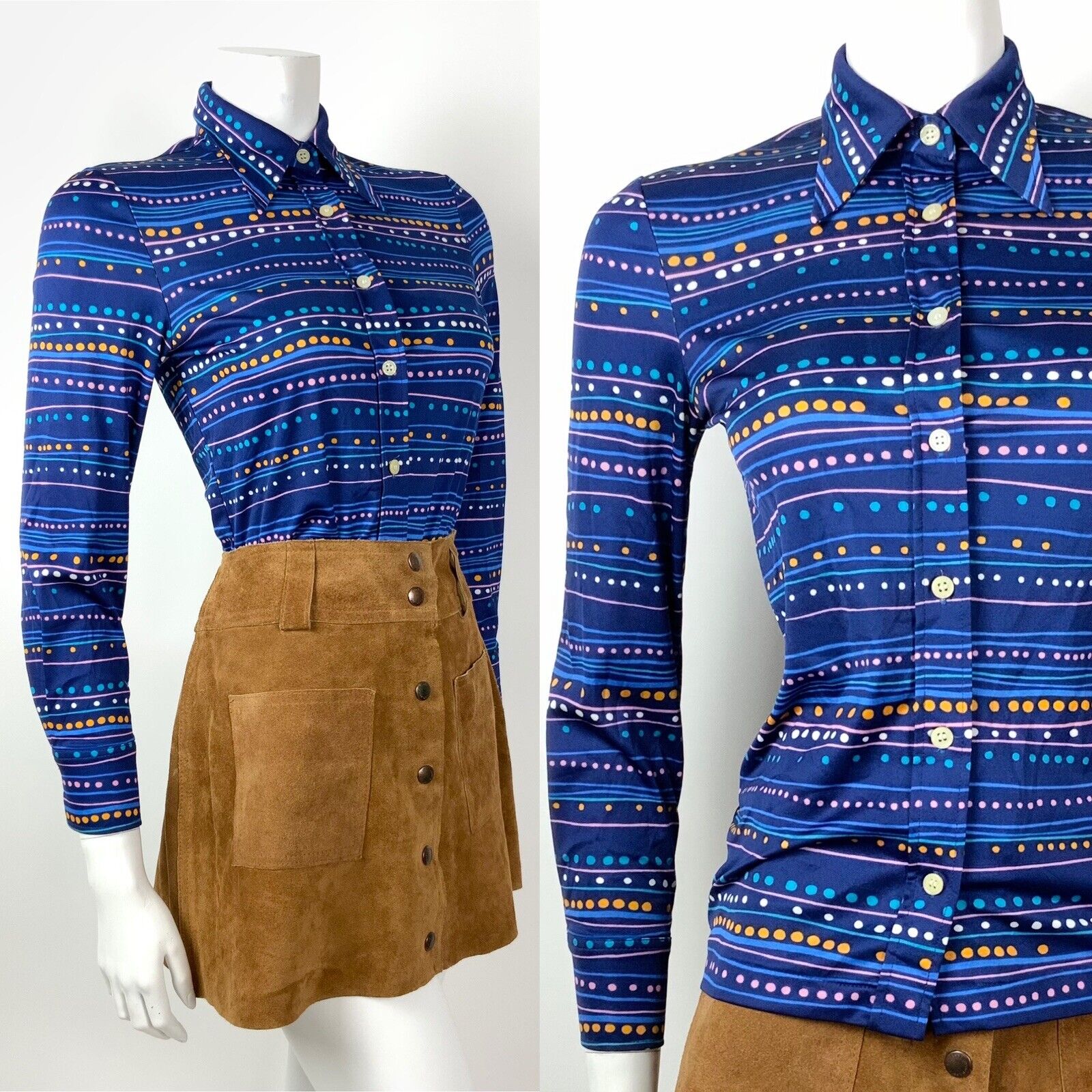 VTG 70s 90s BLUE PINK ORANGE WHITE STRIPED DOTTY PSYCHEDELIC DAGGER SHIRT 8 10