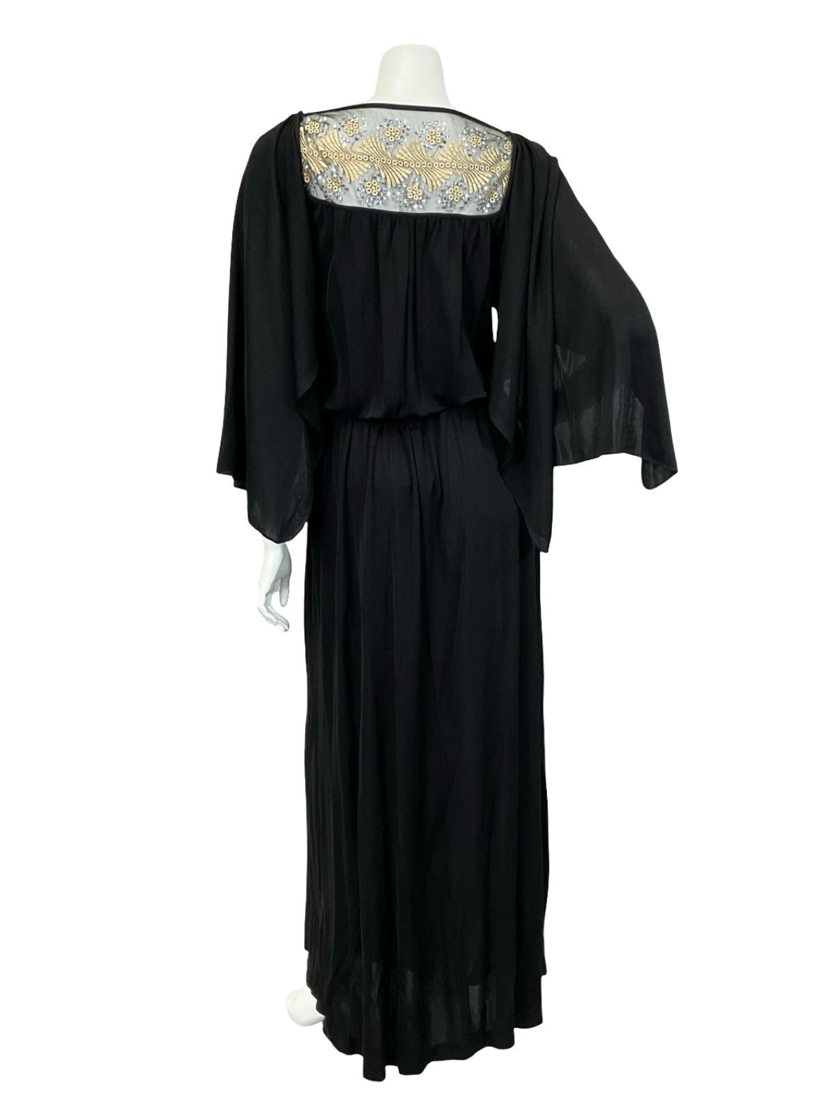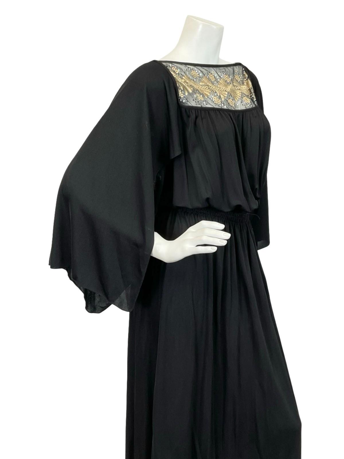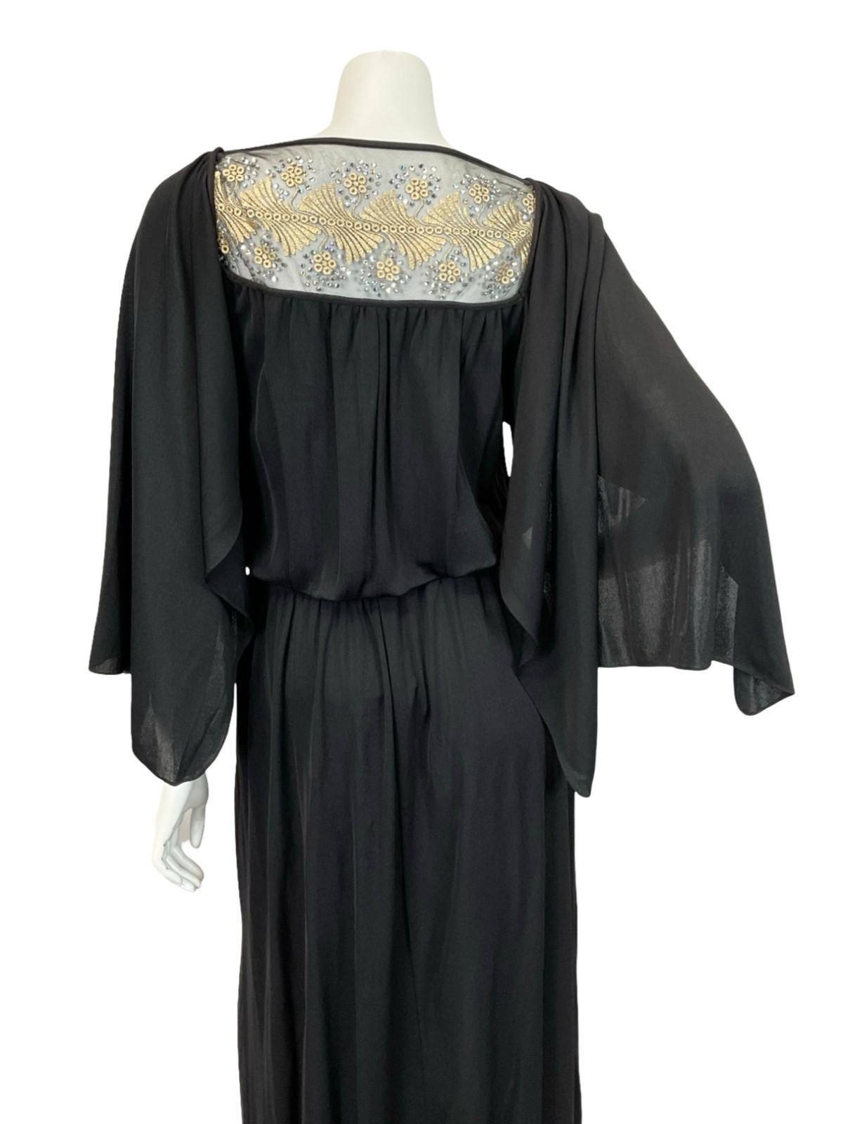 VTG 70S BLACK GOLD EMBROIDERED BOHO FLOATY BLOUSON CAPE SLEEVE MAXI DRESS 6