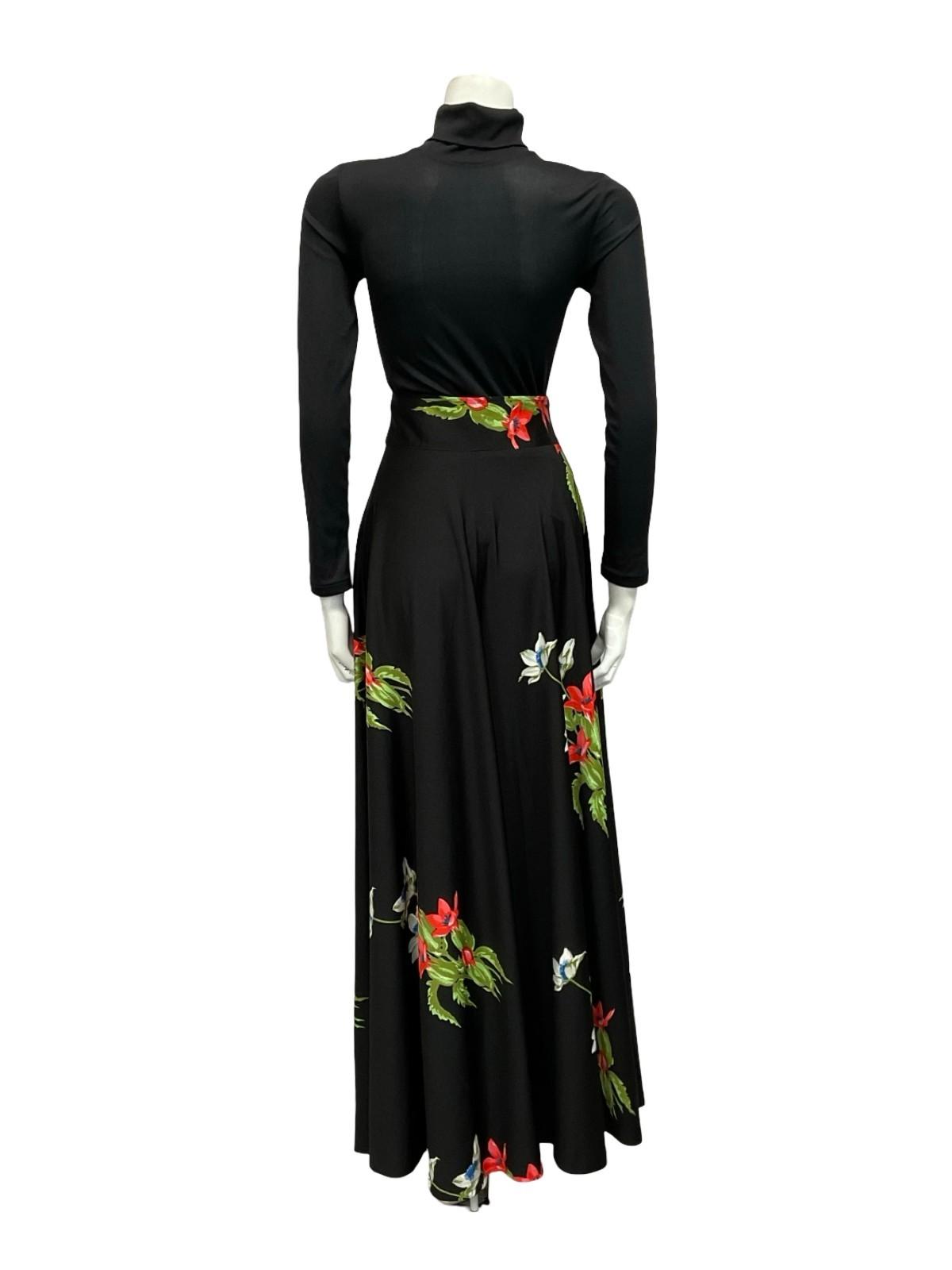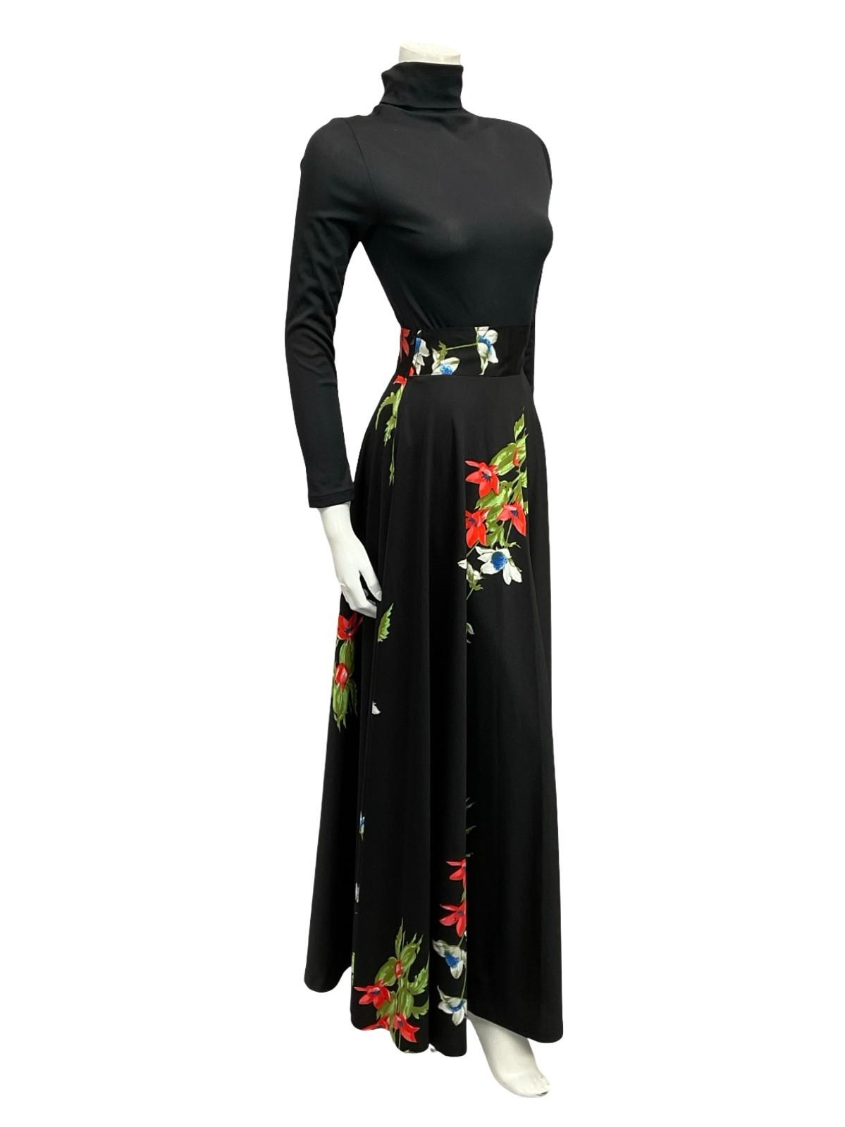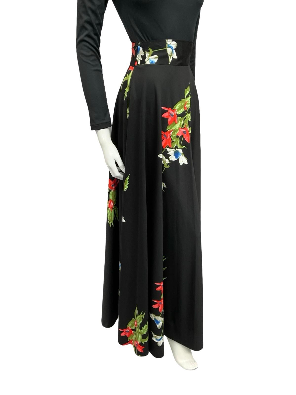 This is a gorgeous 70s floaty black polyester maxi skirt printed with white and red flowers. This skirt has no inner lining, and fastens via a zipper to the side of the waist.