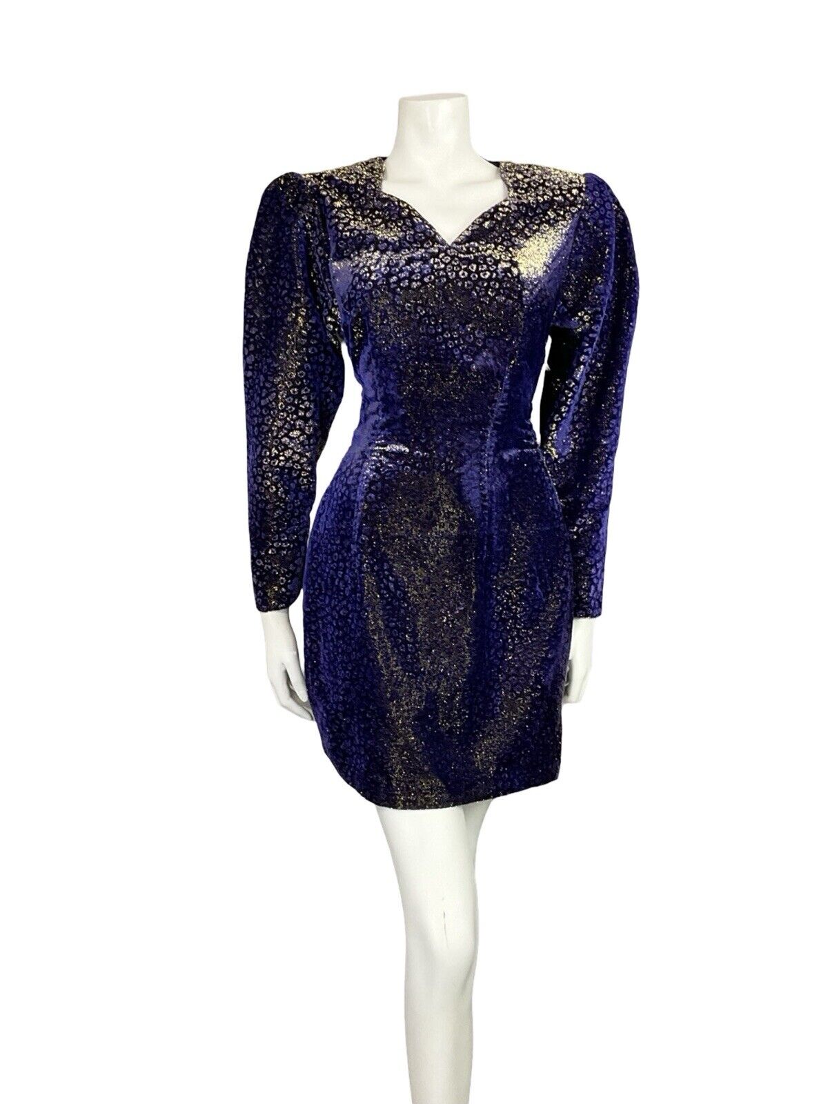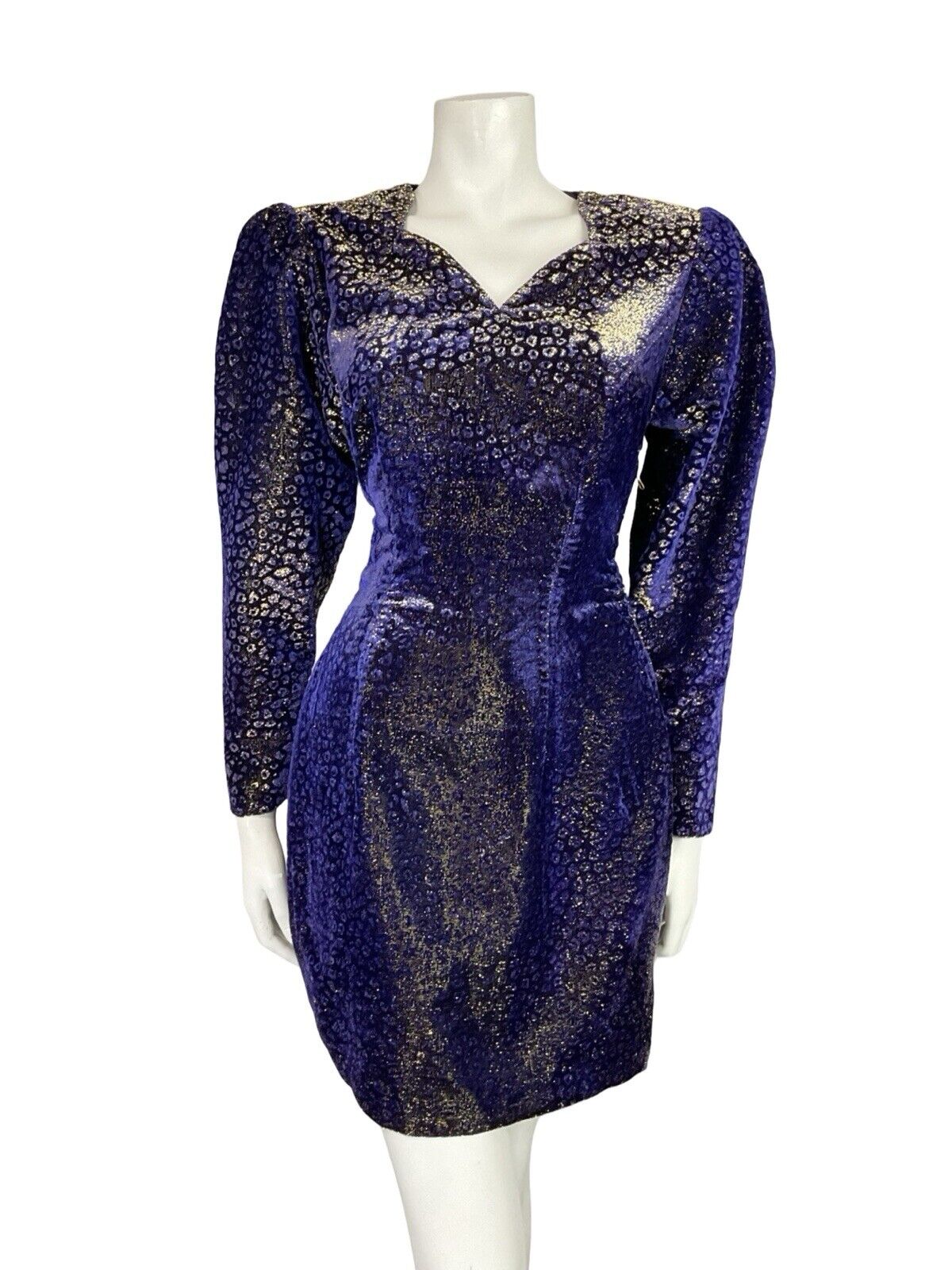 VTG 70S BLUE PURPLE GOLD LUREX VELVET MUTTON SLEEVE SWEETHEART PARTY DRESS 6