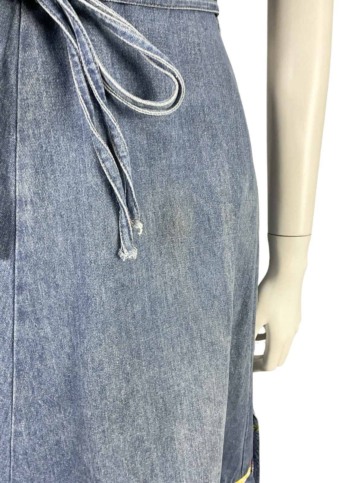VTG 70S BLUE RED YELLOW DENIM RIC RAC HIPPY RUFFLE BEADED WRAP DRESS 8