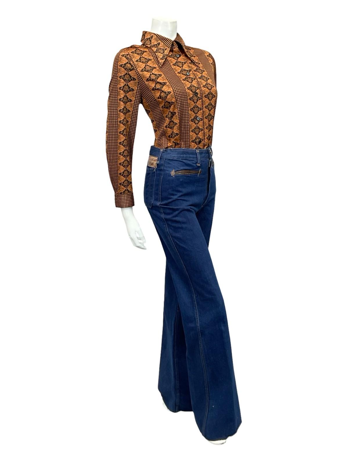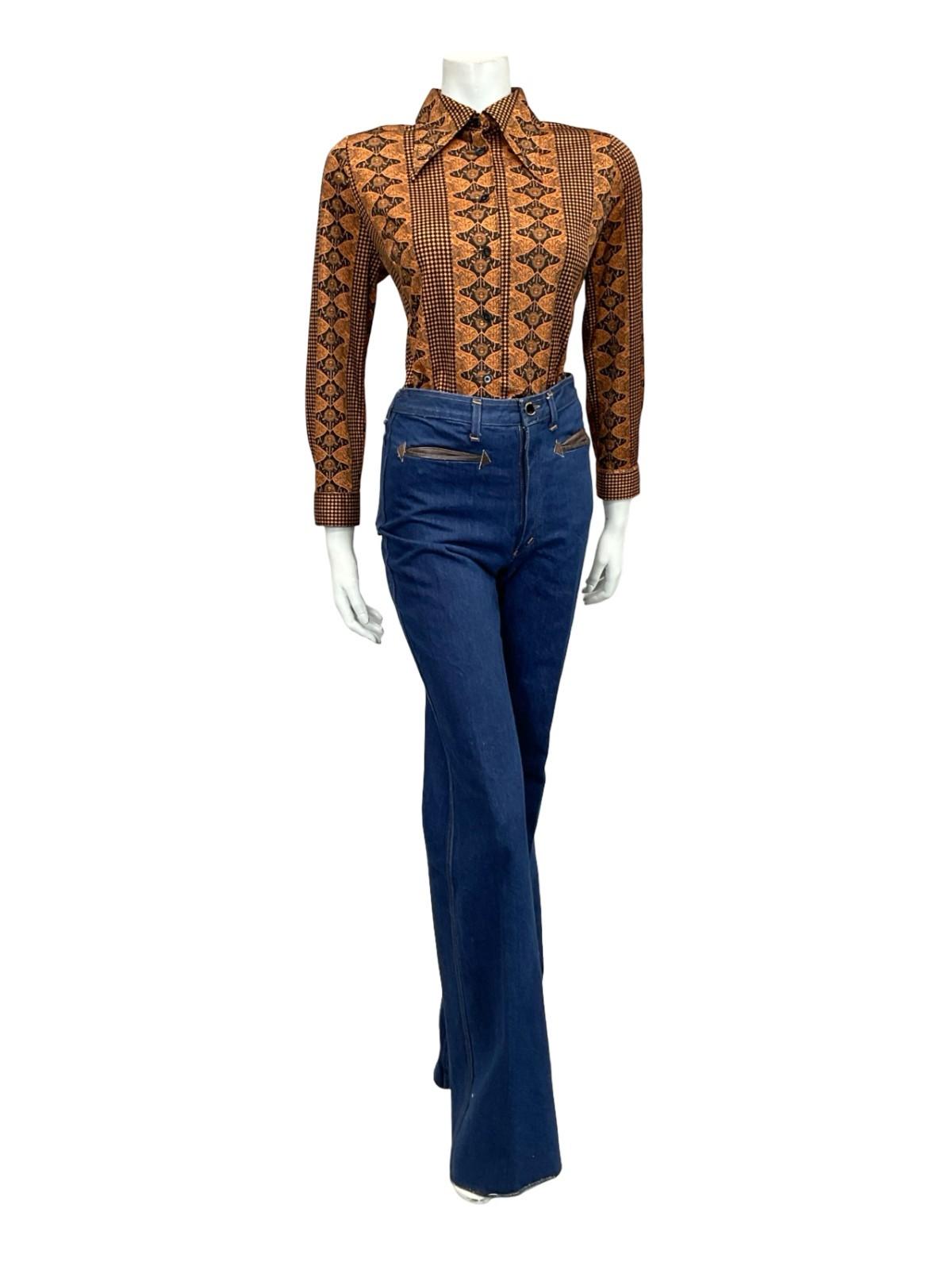 This is a lovely 60s 70s Japanese dagger collar long sleeve shirt. This shirt appears to be made from synthetics, and features a black and brown print of checkerboard striped and art deco borders. This shirt has 7 black buttons down the front to fasten you in, alongside two on either cuff.