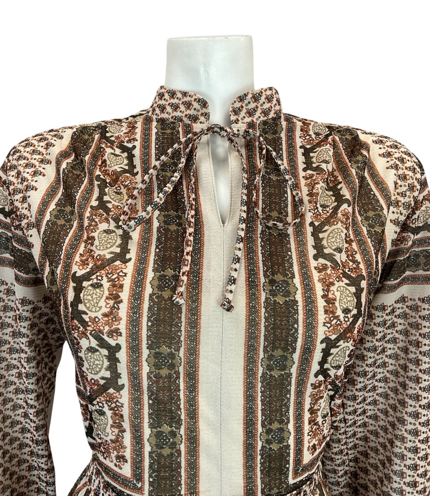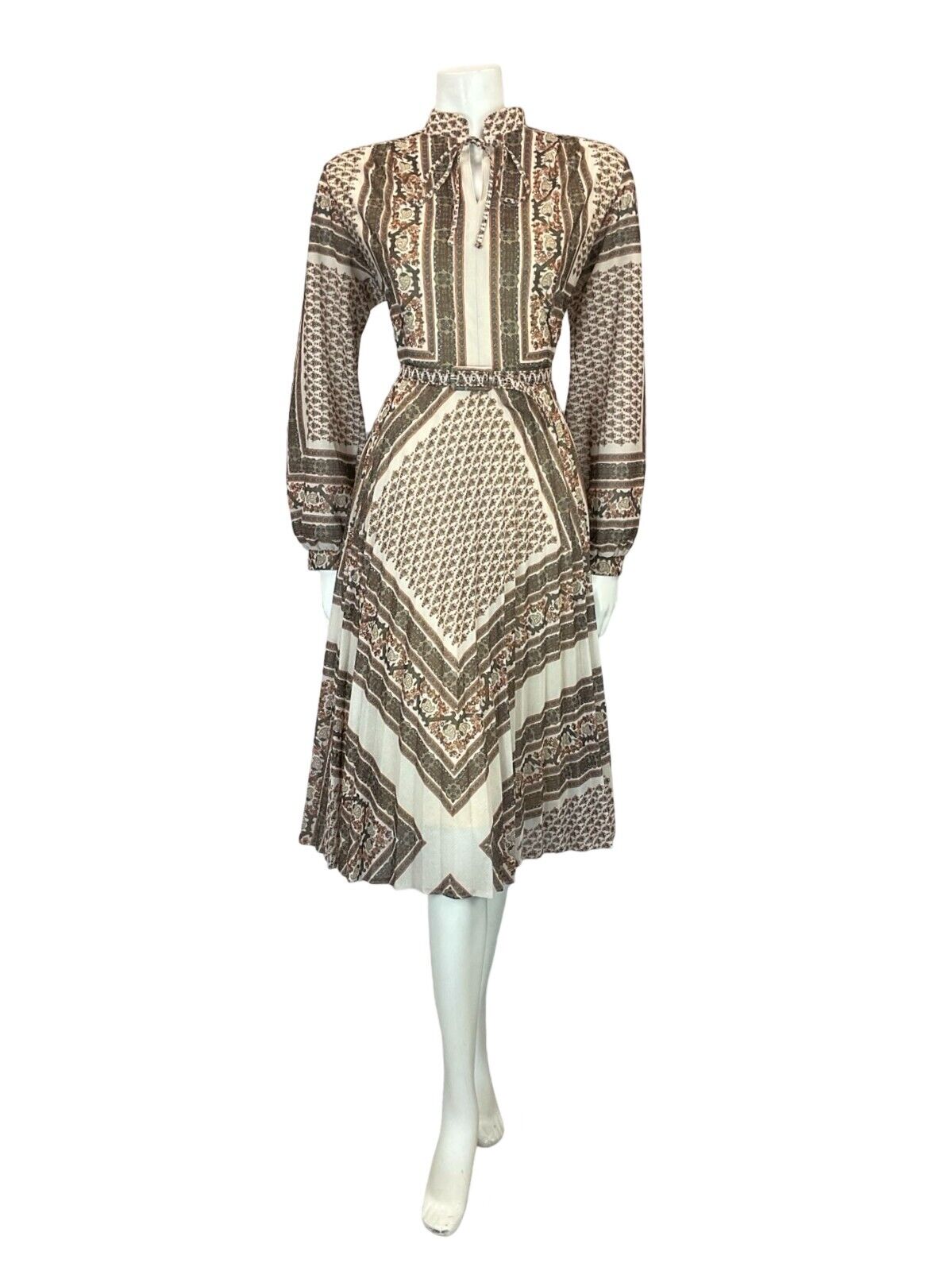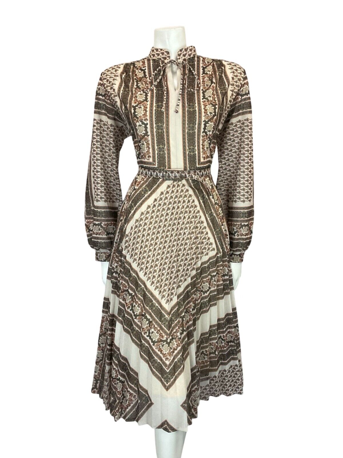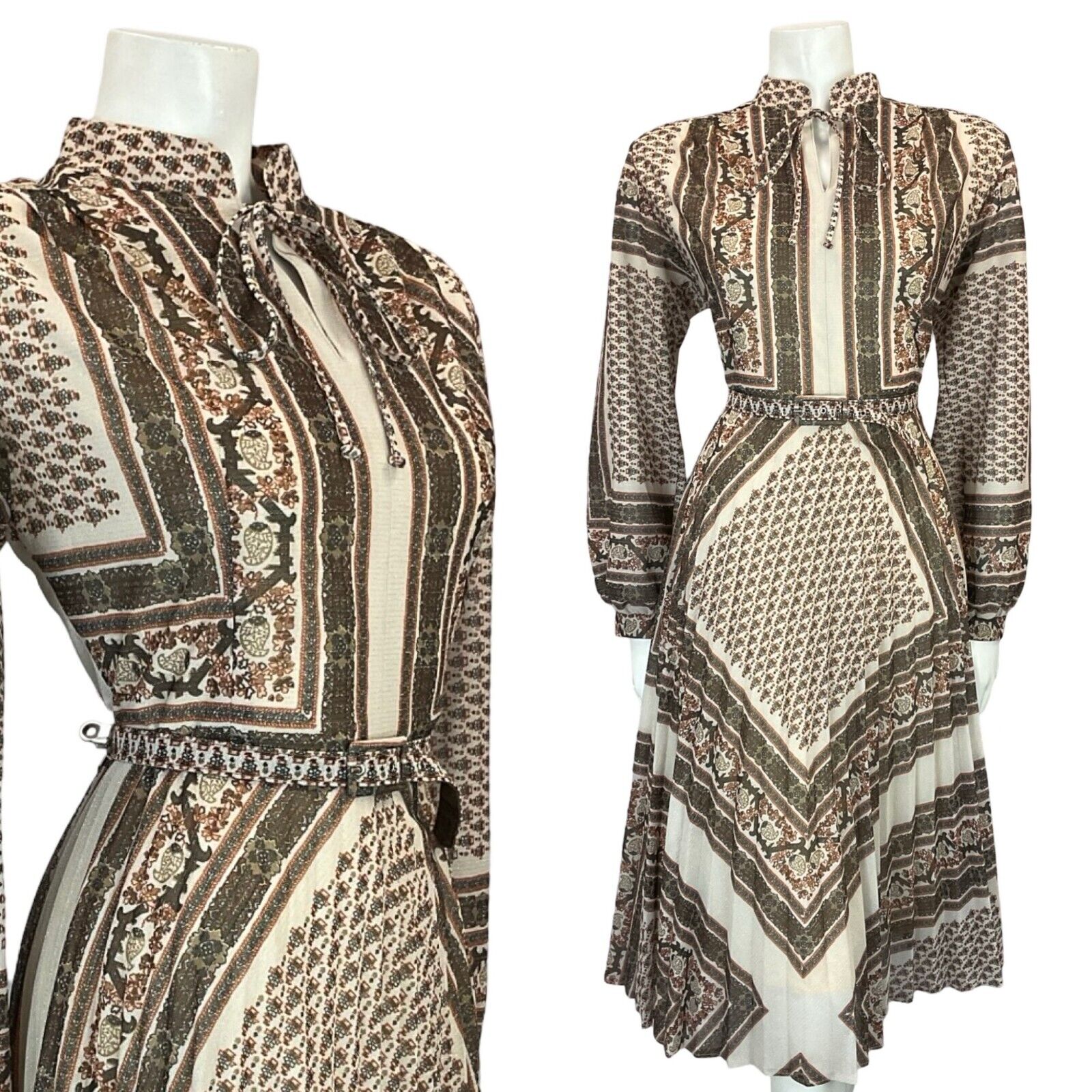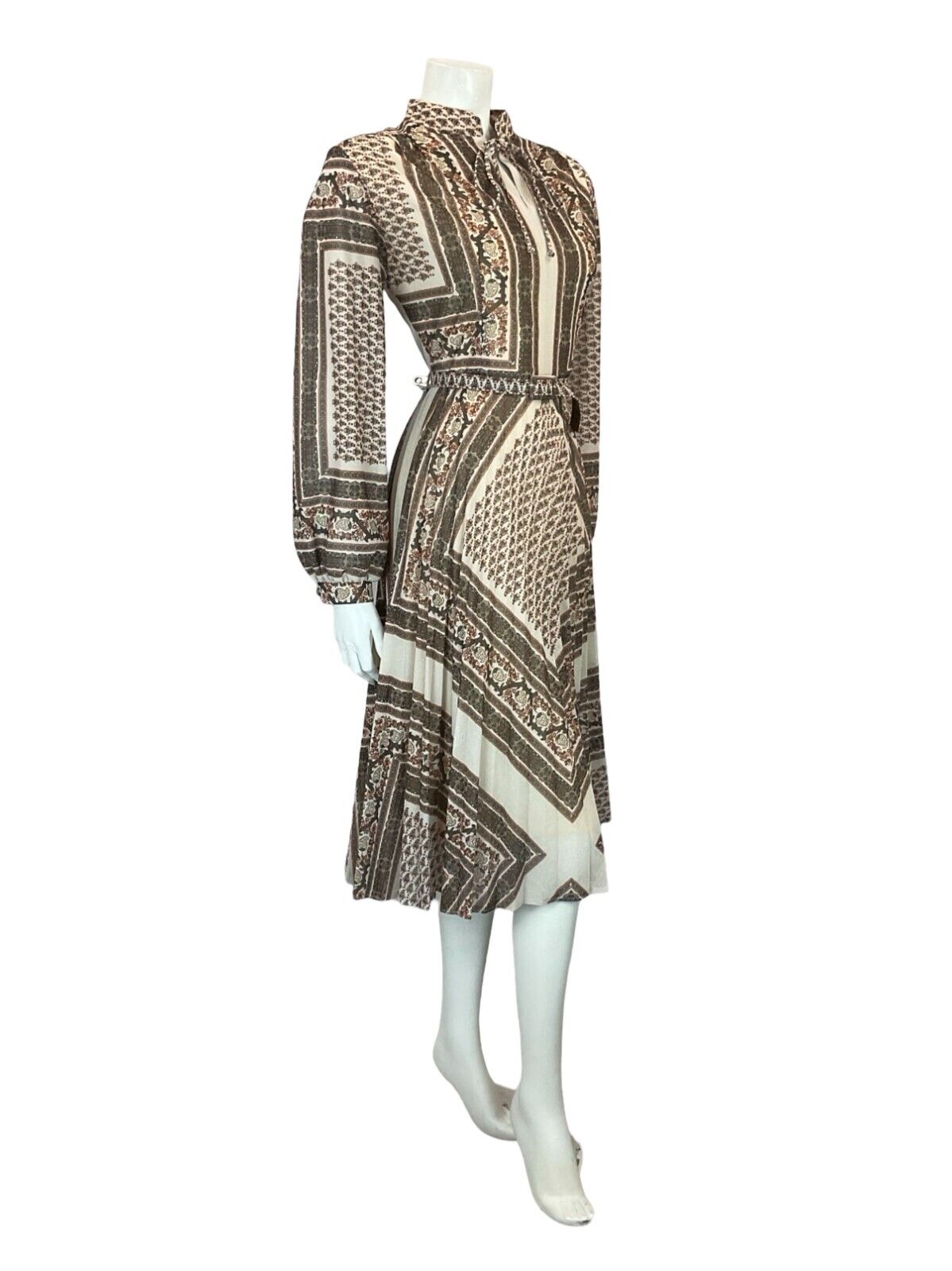 VTG 70S BROWN CREAM SPARKLY BOHO FORAL GEOMETRIC PLEATED BELTED DRESS 12