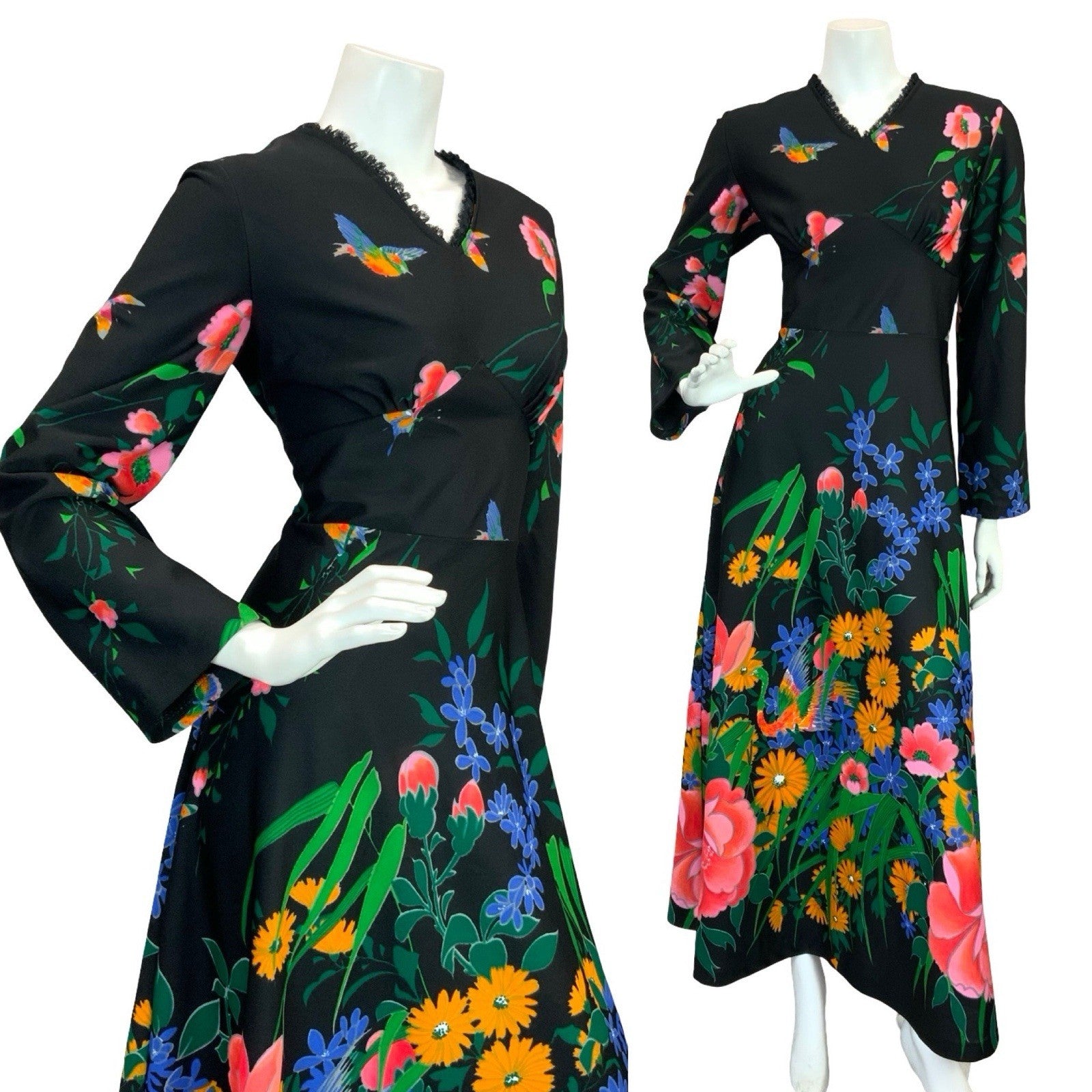 VTG 70S GARDEN FLORAL MAXI DRESS BLACK YELLOW BLUE PINK GREEN