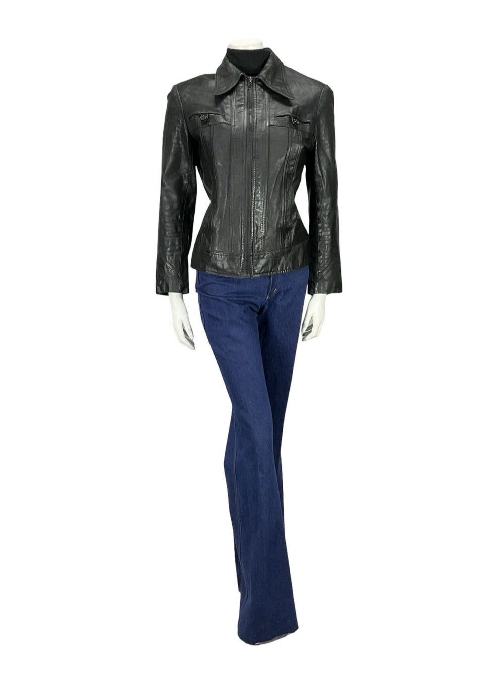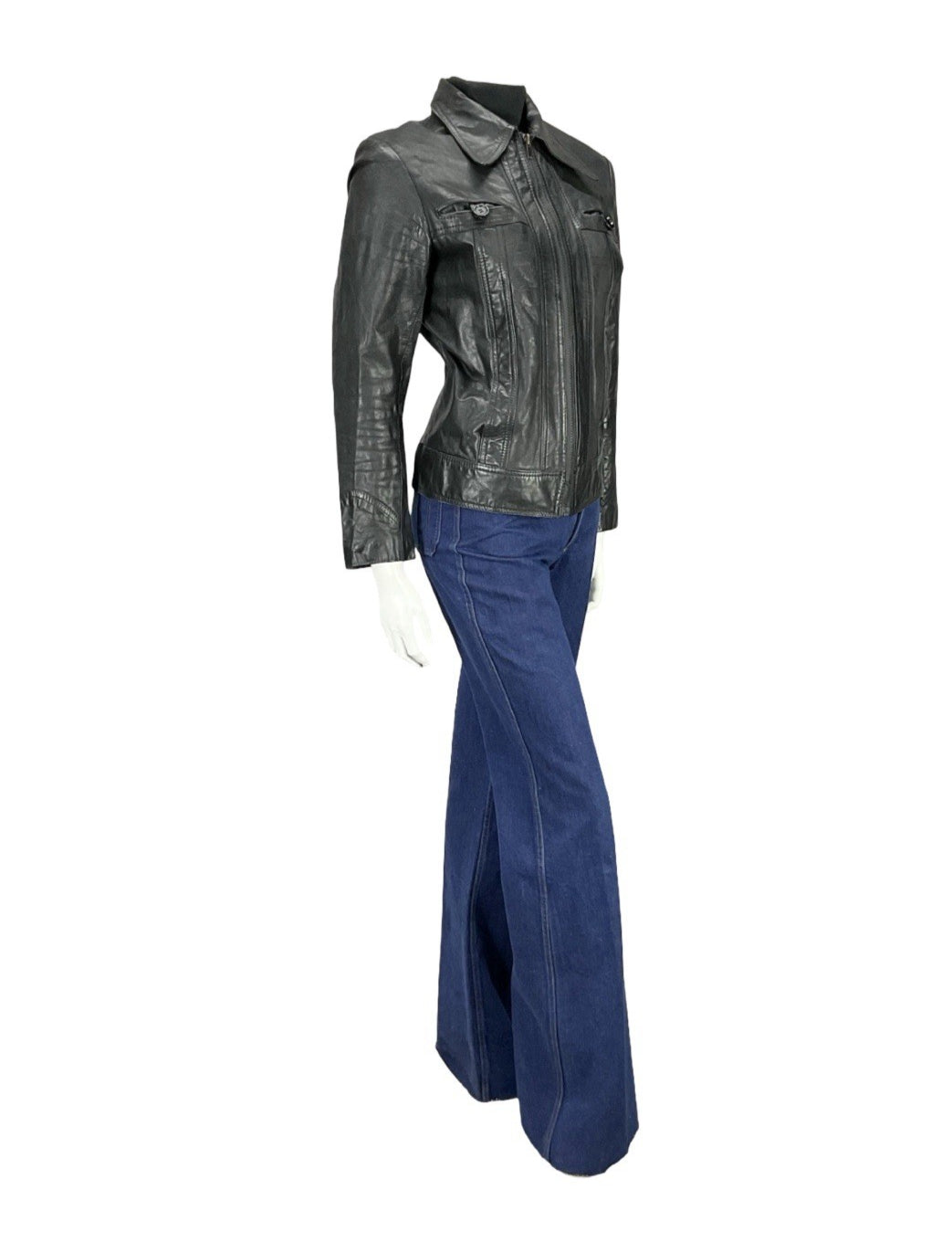 VTG 70S JET BLACK DAGGER COLLAR WELT POCKET ZIP UP LEATHER PUNK JACKET 10 12