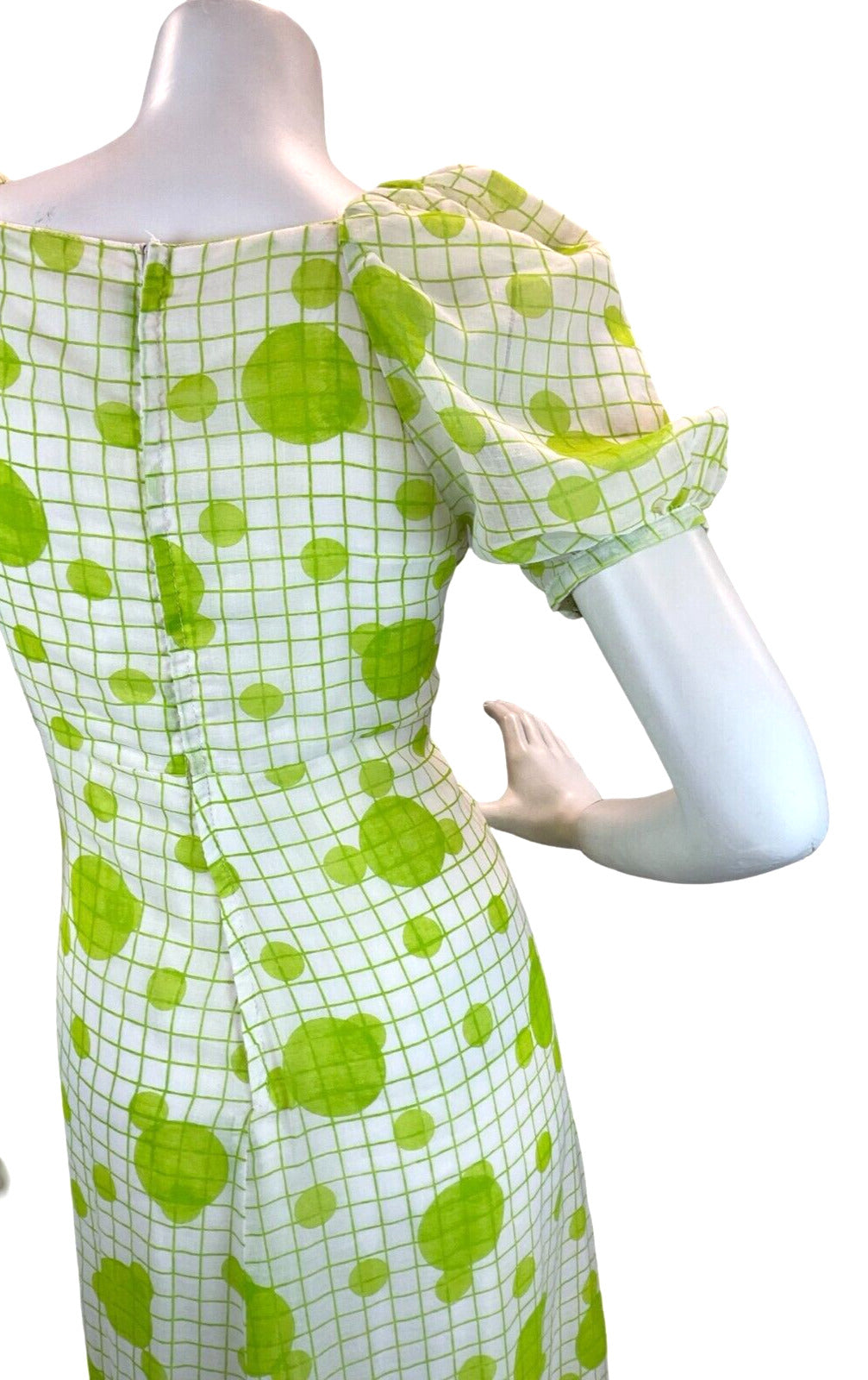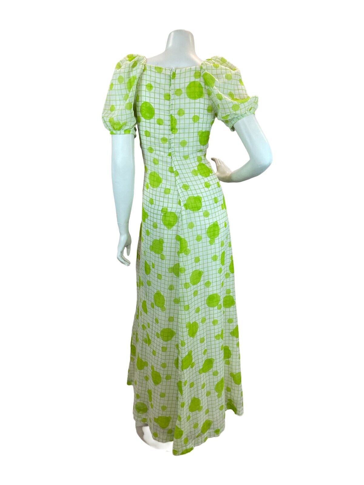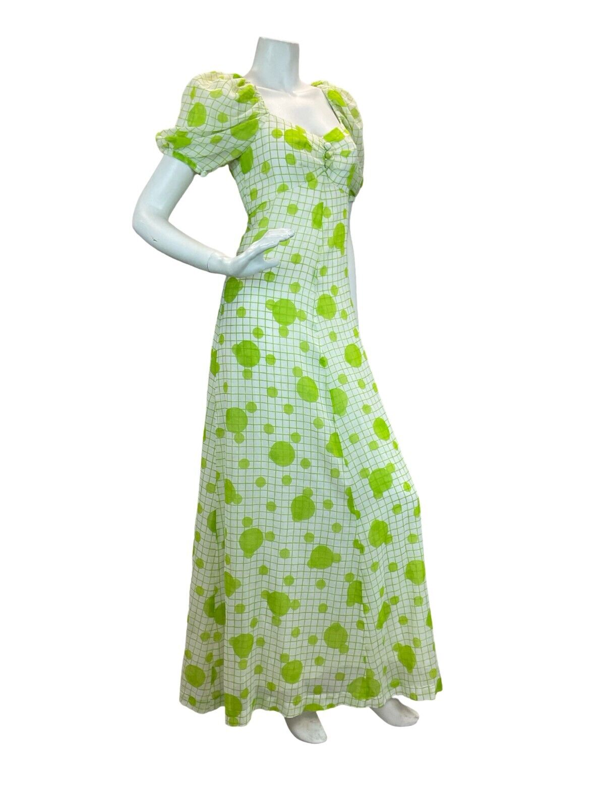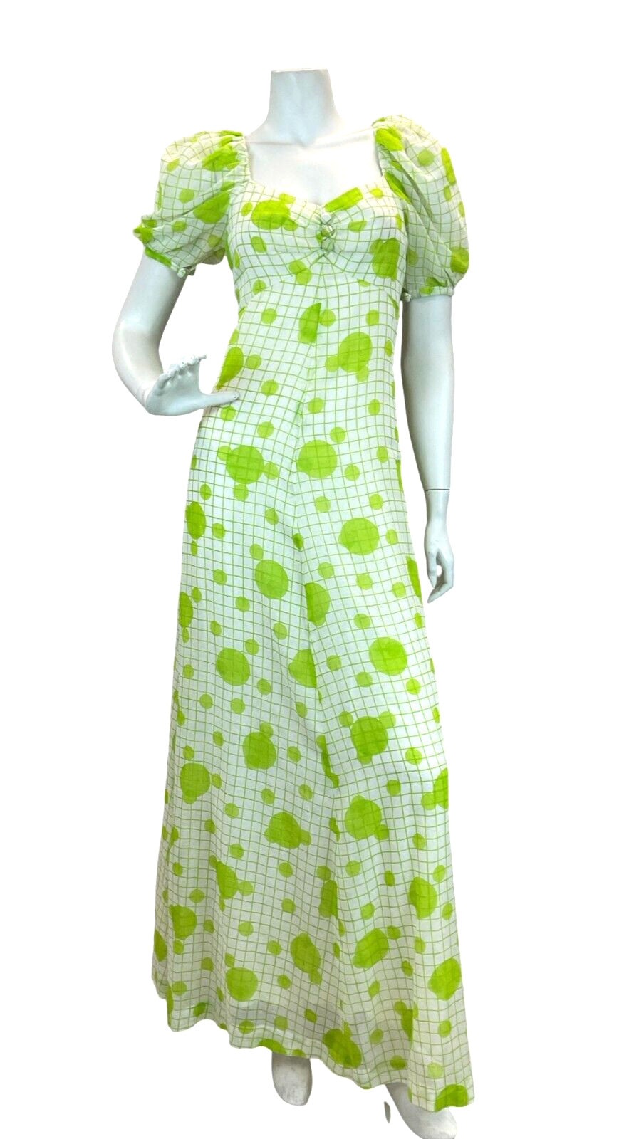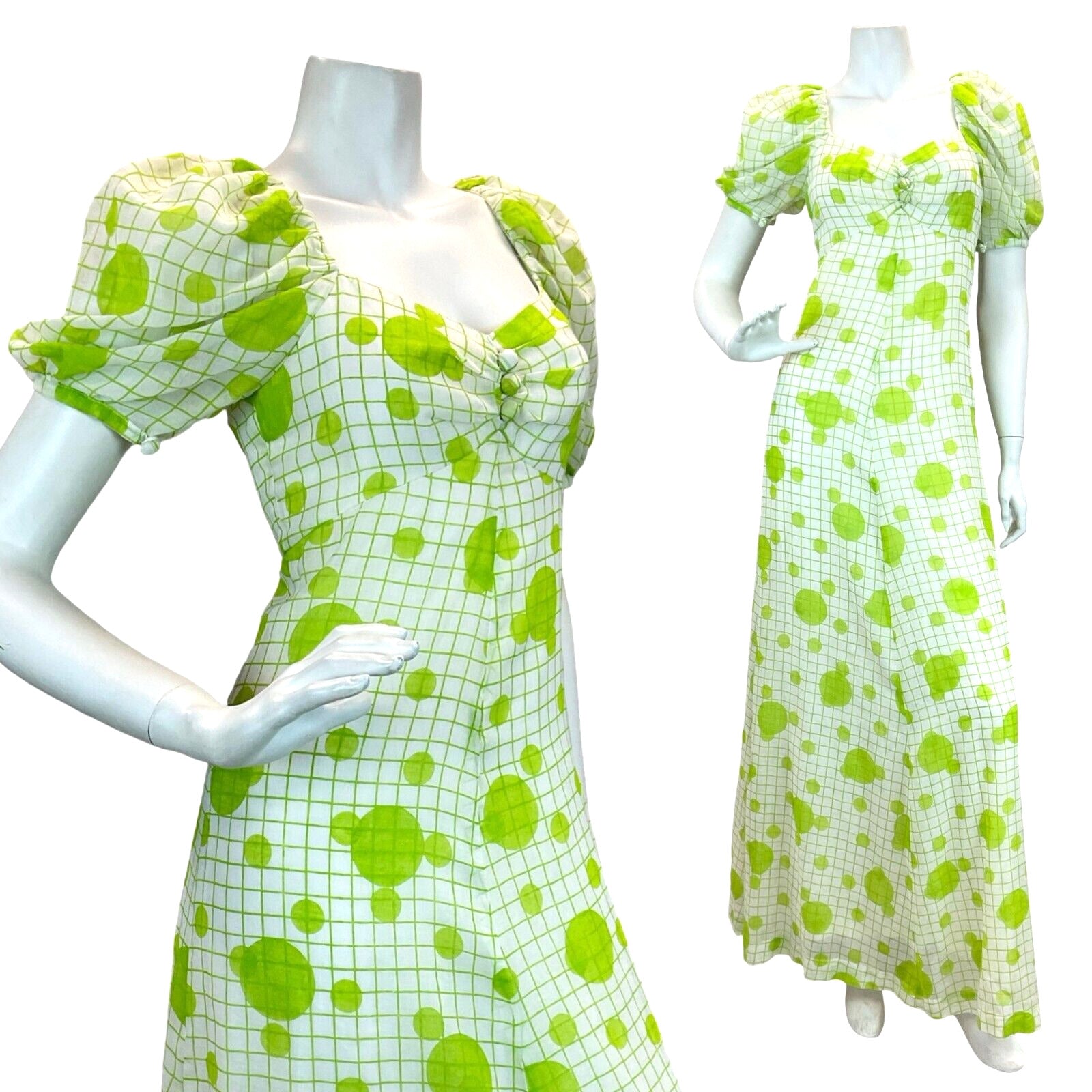 This is a beautiful original vintage 1970s maxi dress in a light linen type polyester fabric printed with a fresh apple green grid and dot pattern. The dress has a shaped, gathered empire line bust with sweetheart neckline, short puff sleeves that fasten with a covered button and three covered buttons at the front. It is fully lined and zips up the back to fasten. This garment would best suit a UK size 8 but please refer to the measurements below.