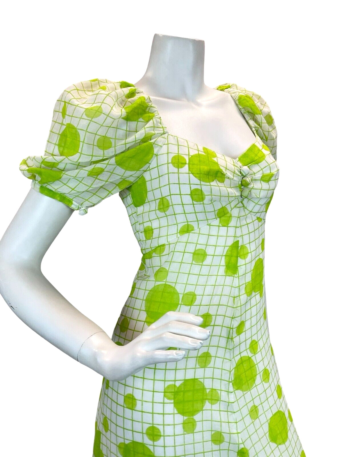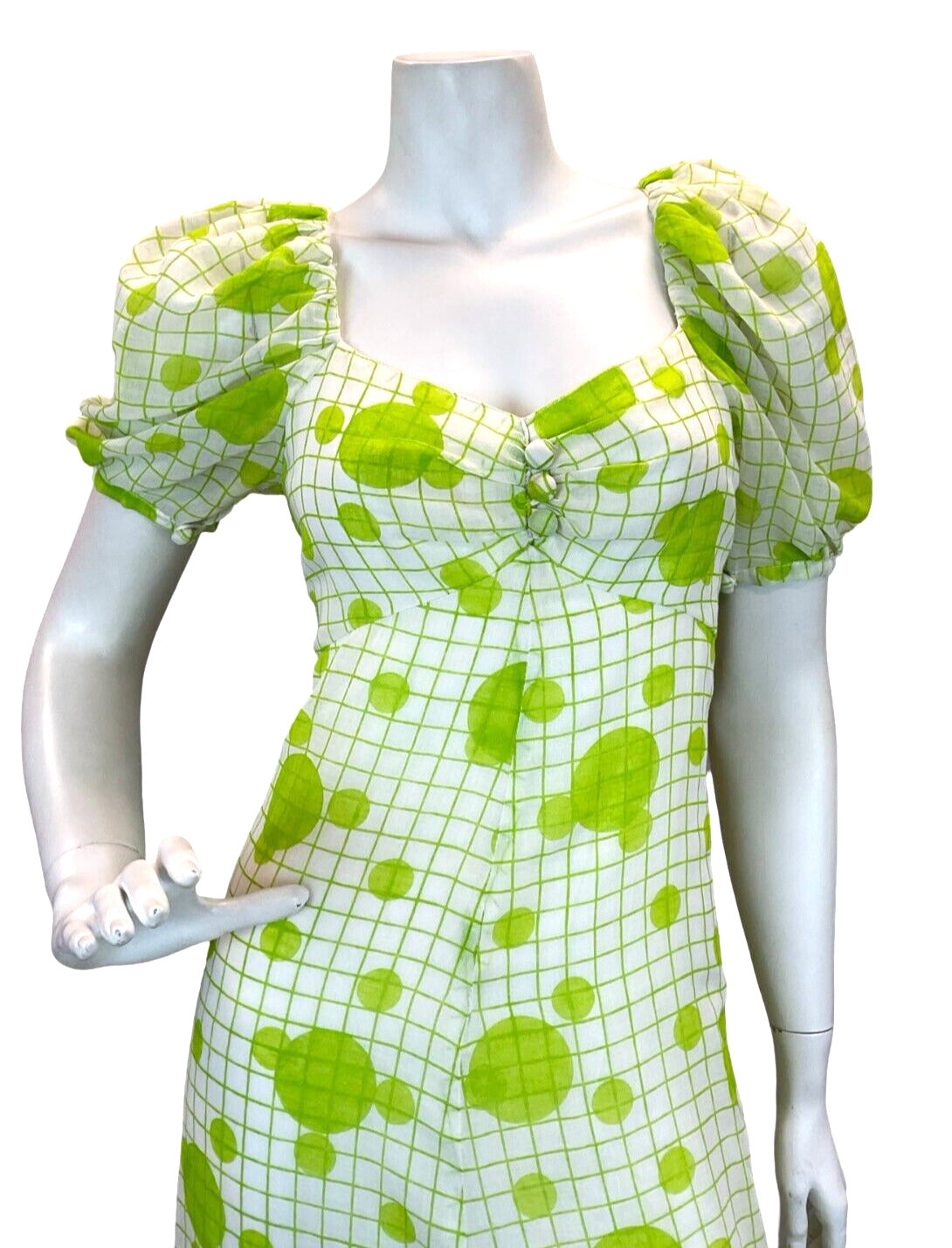 VTG GLAM FESTIVAL LINEN WHITE GREEN GRID DOT EMPIRE MAXI DRESS 8