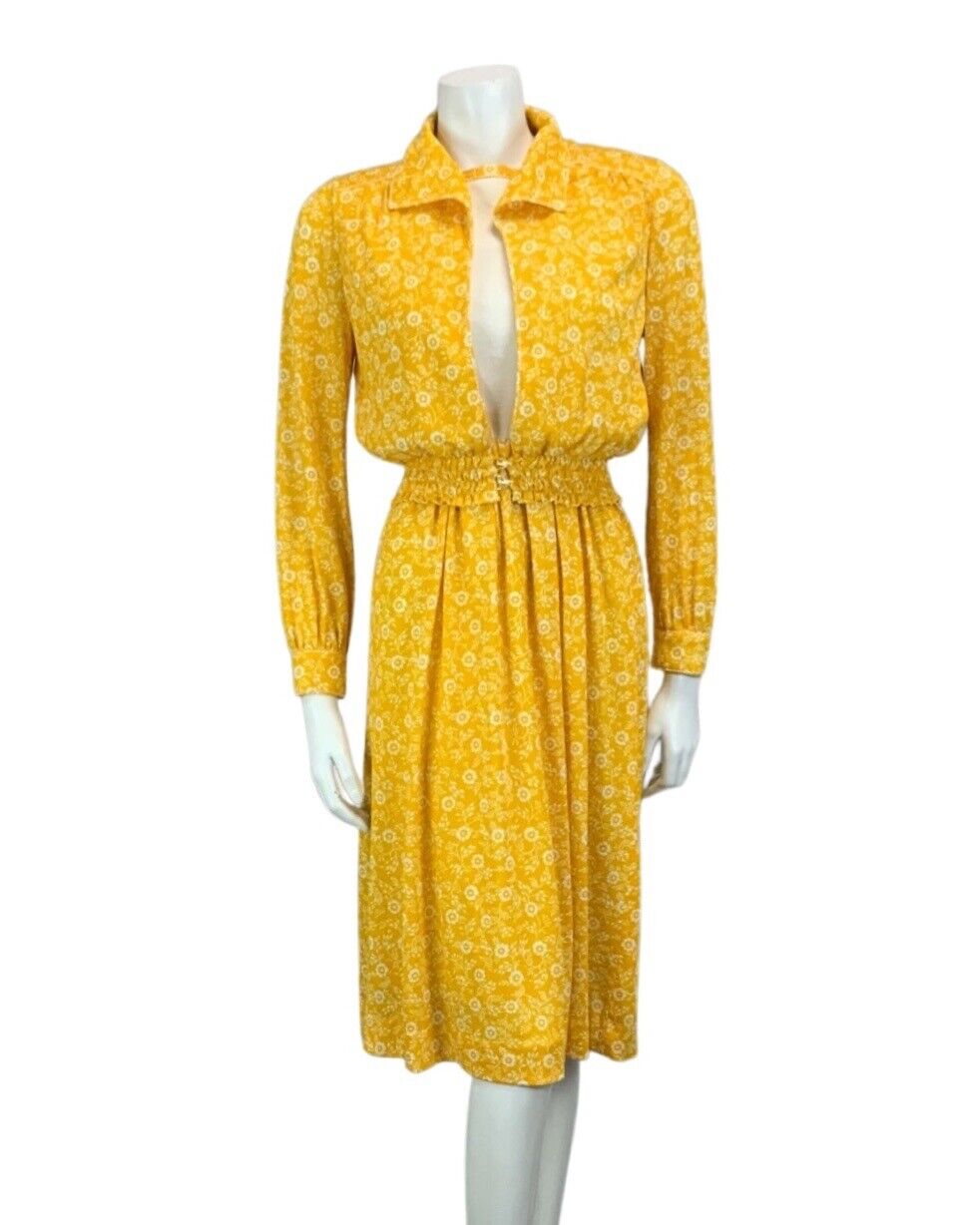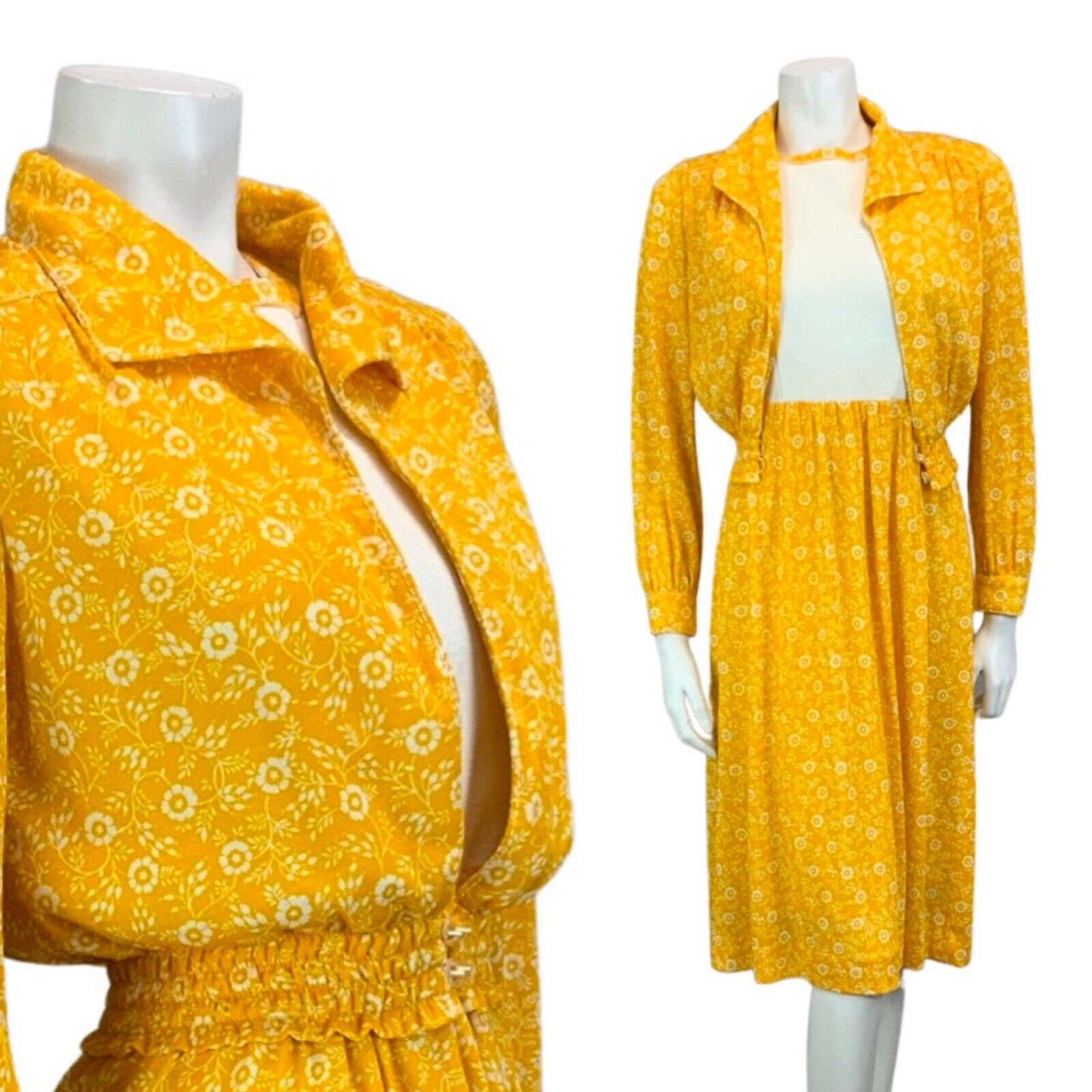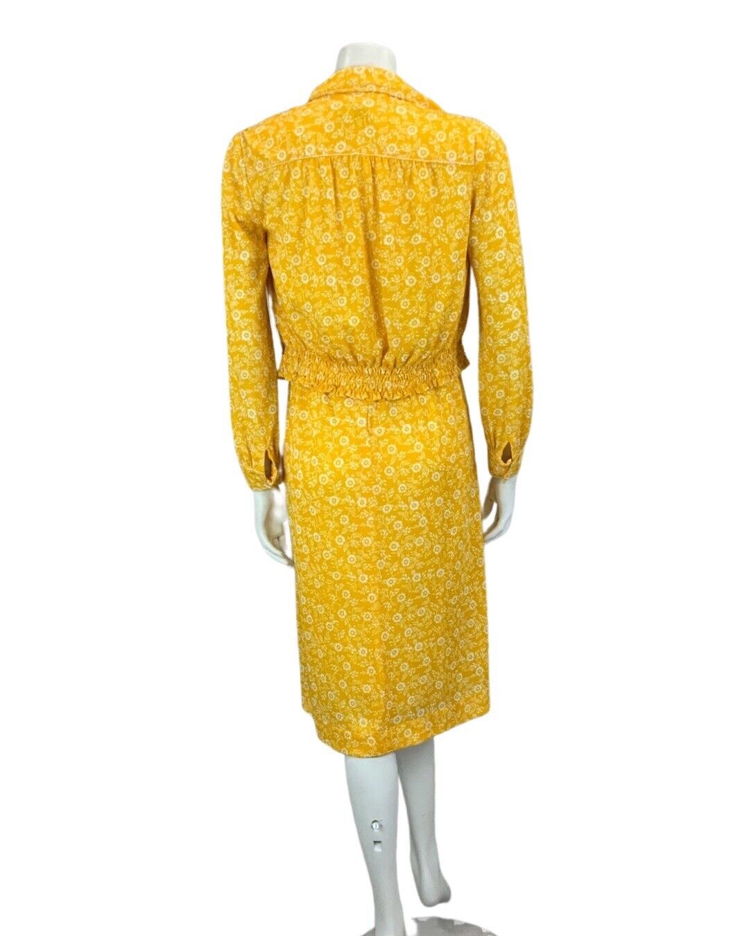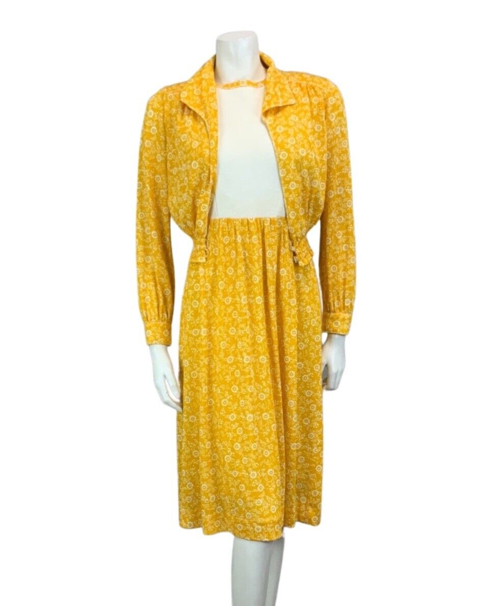 VTG MUSTARD YELLOW WHITE FLORAL PRINT TWO PIECE JACKET DRESS 60s 70s 10